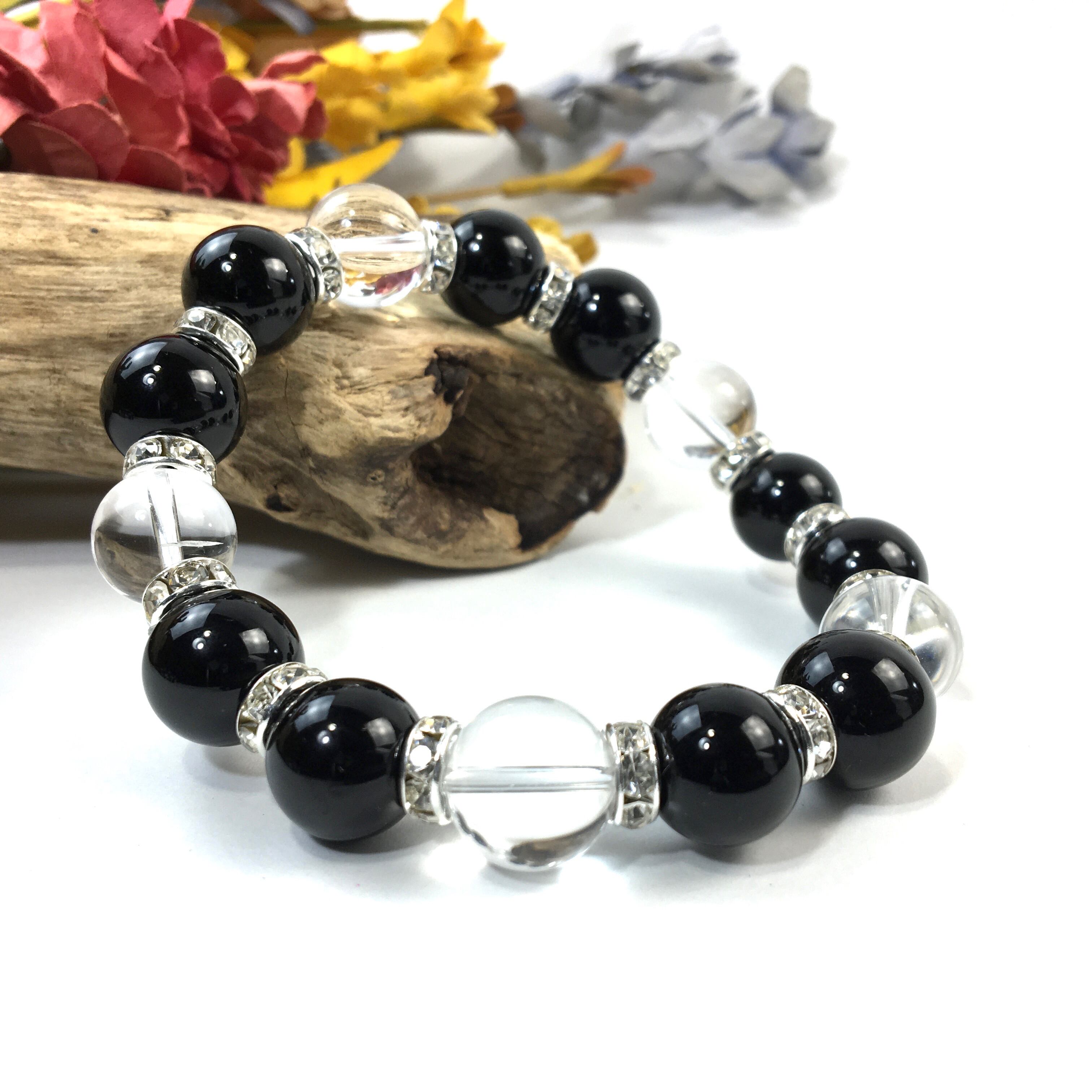 こちらは、オニキスと水晶を組み合わせたパワーストーンブレスレットです。間にはロンデルを挟み高級感あるデザインに仕上げております。石大きさは12mm玉を使用して内周約18cmです。気になる方は是非この機会にどうぞ。