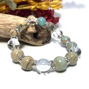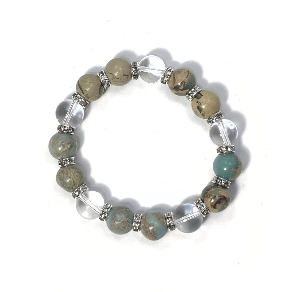 こちらは、インプレッションストーンと水晶を組み合わせたパワーストーンブレスレットです。間にはロンデルを挟み高級感あるデザインに仕上げております。石大きさは12mm玉を使用して内径約18cmです。気になる方は是非この機会にどうぞ。