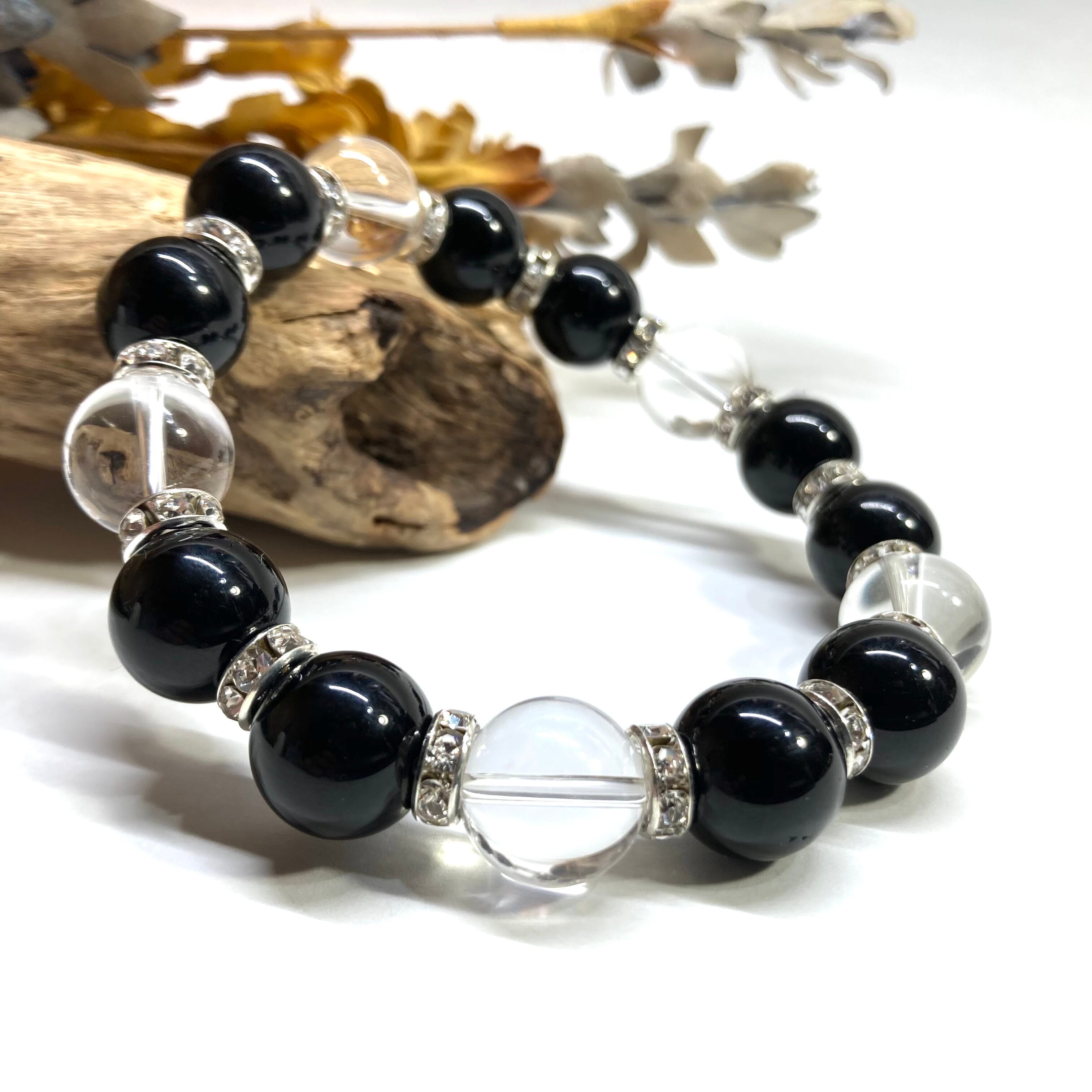 こちらは、10mm玉のモリオンと水晶を組み合わせたパワーストーンブレスレットです。間にはロンデルを挟み高級感あるデザインに仕上げております。石大きさは12mm玉を使用して内径約18cmです。数に限りがございますので気になる方はお早めにどうぞ。