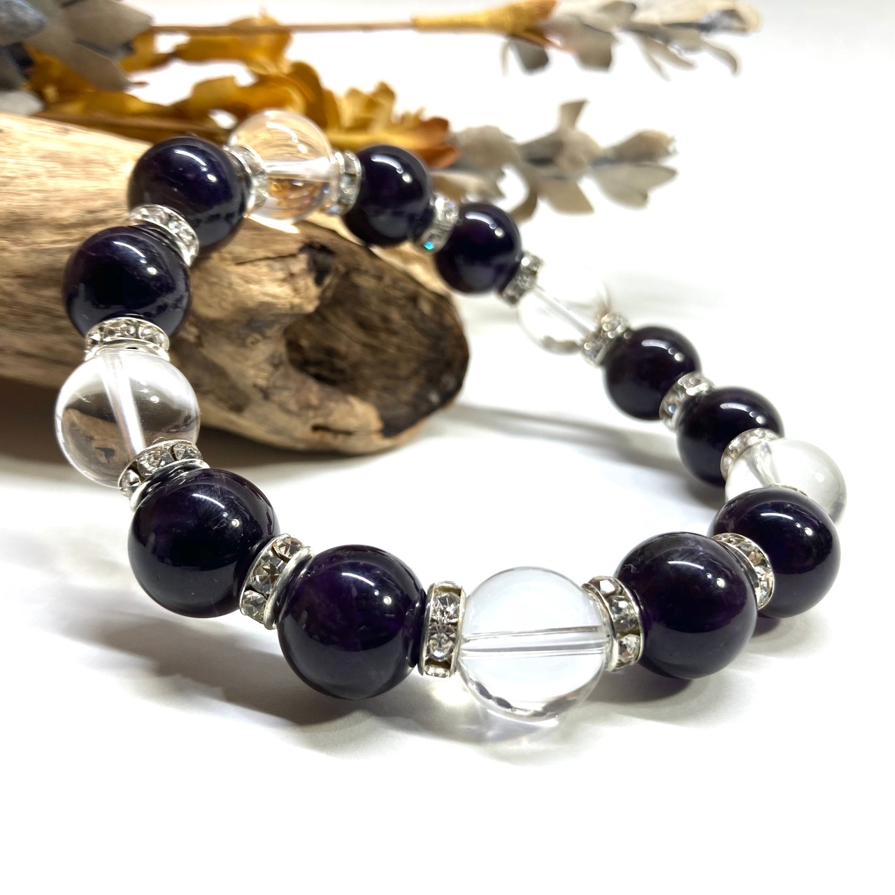 こちらは、10mm玉のアメジストと水晶を組み合わせたパワーストーンブレスレットです。間にはロンデルを挟み高級感あるデザインに仕上げております。石大きさは12mm玉を使用して内径約18cmです。数に限りがございますので気になる方はお早めにどうぞ。
