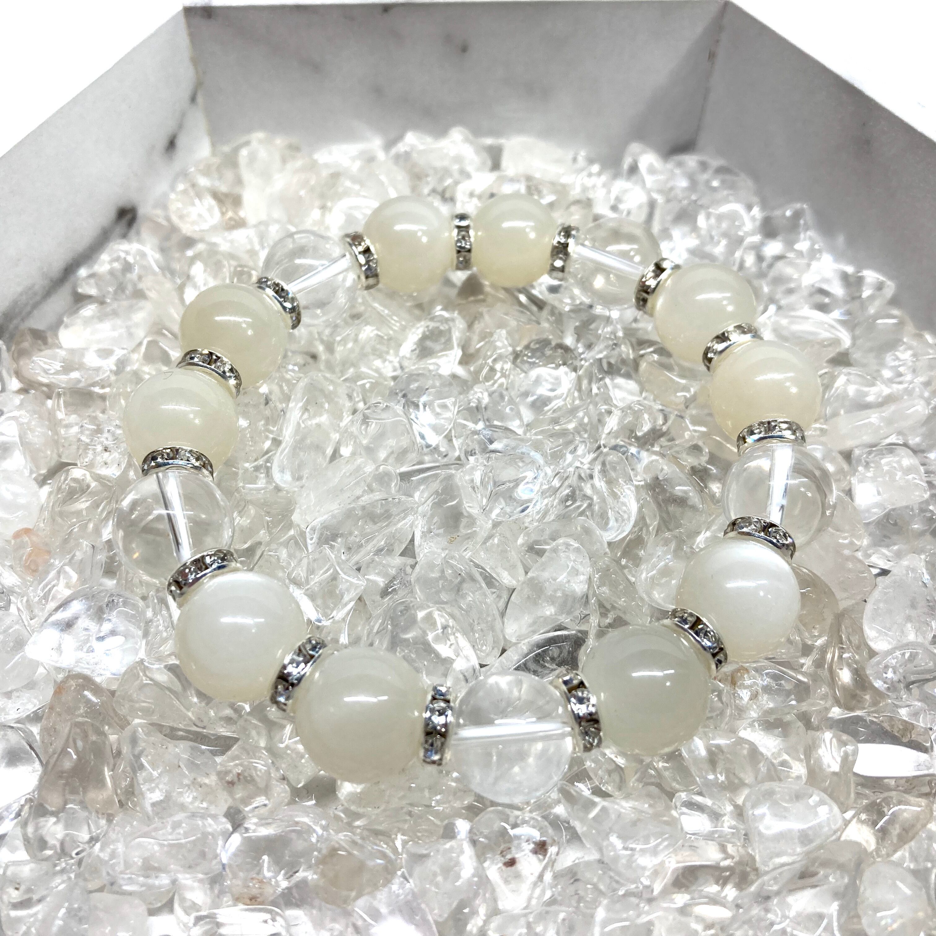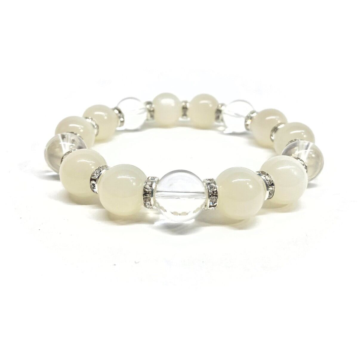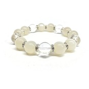 こちらは、12mm玉のムーンストーンと水晶を組み合わせたパワーストーンブレスレットです。間にはロンデルを挟み高級感あるデザインに仕上げております。石大きさは12mm玉を使用して内周約18cmです。気になる方は是非この機会にどうぞ。