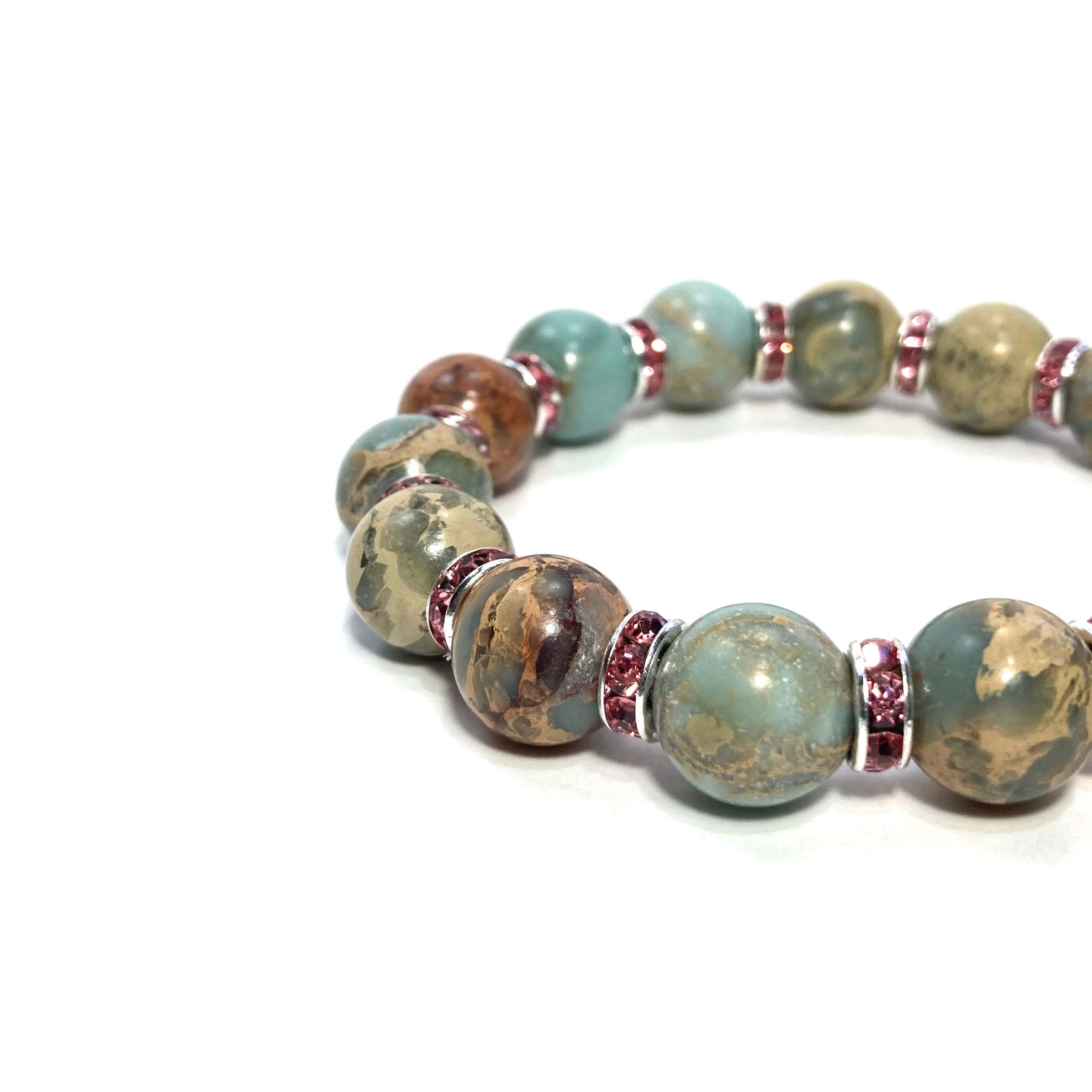こちらは、12mm玉のインプレッションストーンを使用した天然石ブレスレットです。石との間にはロンデルを挟み高級感を演出しています。シンプルなデザインですのでどんなコーディネートとも合わせ易いブレスレットです。石大きさは12mm玉です。内周約18cmです。気になる方は是非この機会にどうぞ。