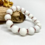 こちらは、12mm玉のホワイトオニキスを使用した天然石ブレスレットです。石との間にはロンデルを挟み高級感を演出しています。シンプルなデザインですのでどんなコーディネートとも合わせ易いブレスレットです。石大きさは12mm玉です。内周約18cmです。数に限りがございますので気になる方はお早めにどうぞ。