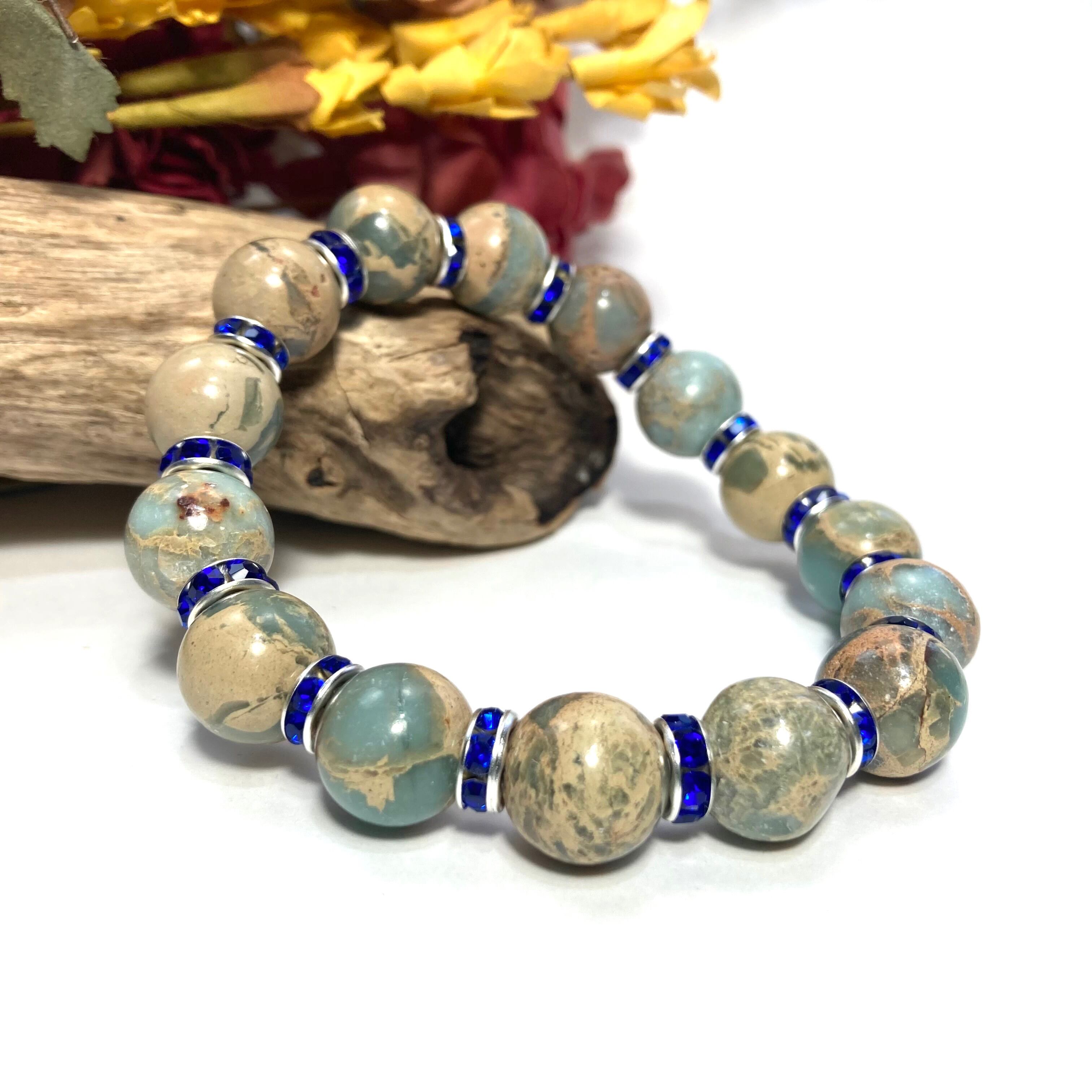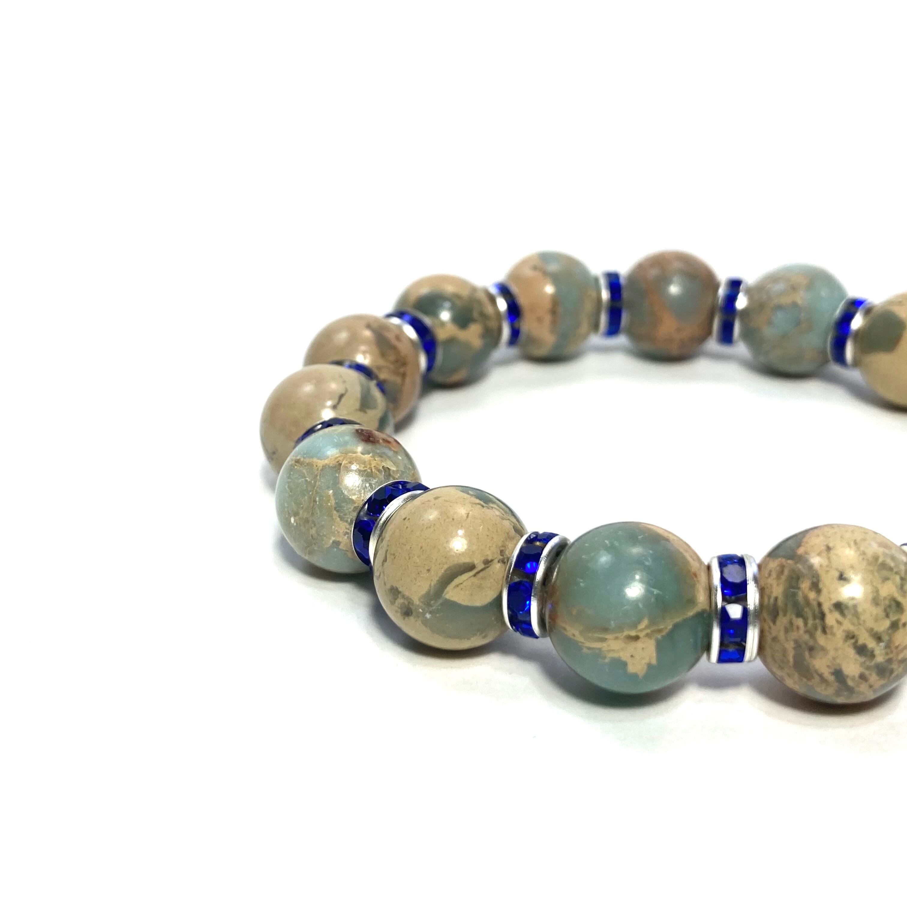 こちらは、12mm玉のインプレッションストーンを使用した天然石ブレスレットです。石との間にはロンデルを挟み高級感を演出しています。シンプルなデザインですのでどんなコーディネートとも合わせ易いブレスレットです。石大きさは12mm玉です。内周約18cmです。気になる方は是非この機会にどうぞ。