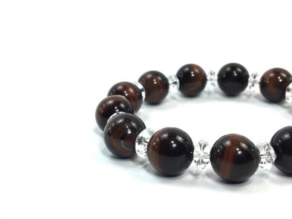 こちらは、レッドタイガーアイを使用したブレスレットです。間には水晶ソロバンが挟まれてアクセントとなっております。石大きさは腕にも馴染みやすいように12mm玉で内周約17cm(伸可能)です。気になる方は是非この機会にどうぞ。