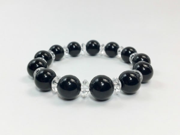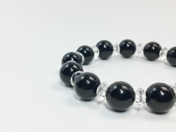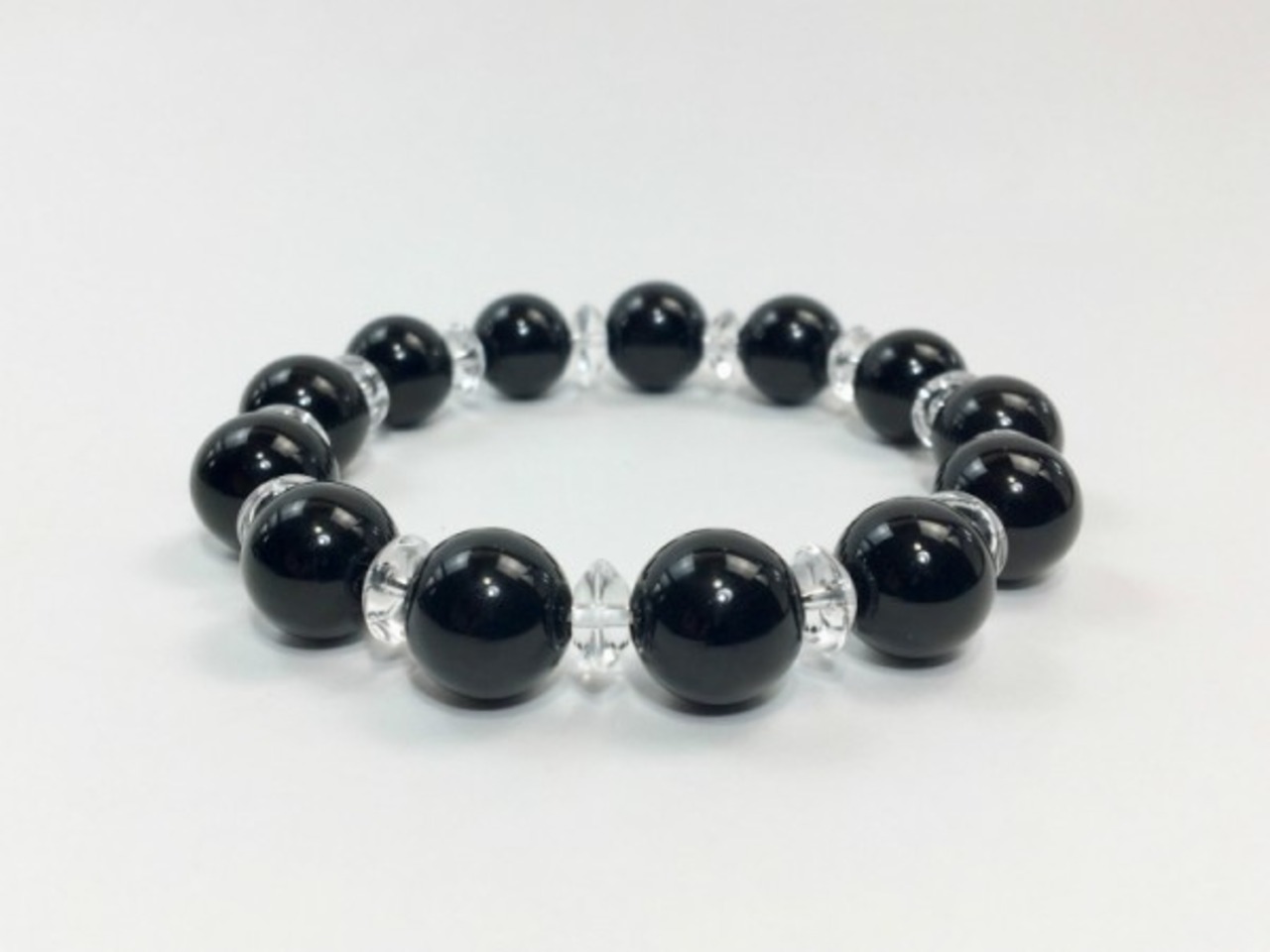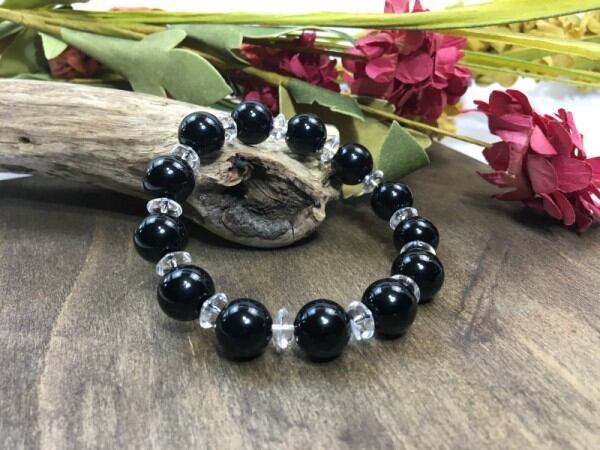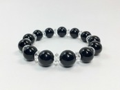 こちらは、オニキスを使用したブレスレットです。間には水晶ソロバンが挟まれてアクセントとなっております。石大きさは腕にも馴染みやすいように12mm玉で内周約17cm(伸可能)です。気になる方は是非この機会にどうぞ。