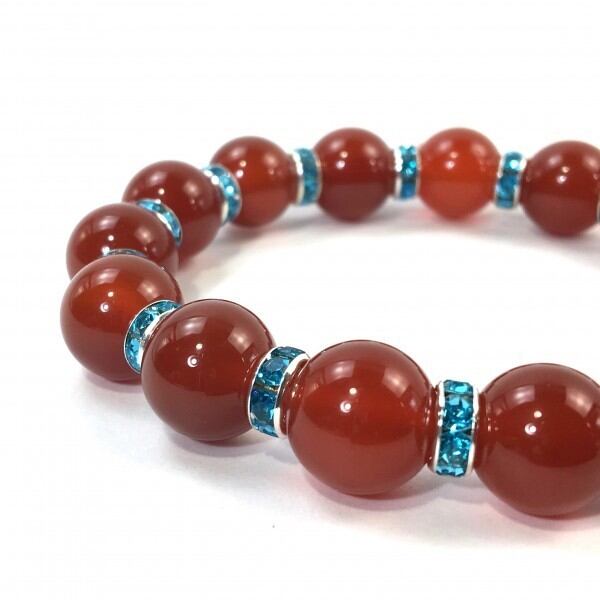 こちらは、12mm玉の赤瑪瑙を使用した天然石ブレスレットです。石との間にはロンデルを挟み高級感を演出しています。シンプルなデザインですのでどんなコーディネートとも合わせ易いブレスレットです。石大きさは12mm玉です。。内周約18cmです。気になる方は是非この機会にどうぞ。