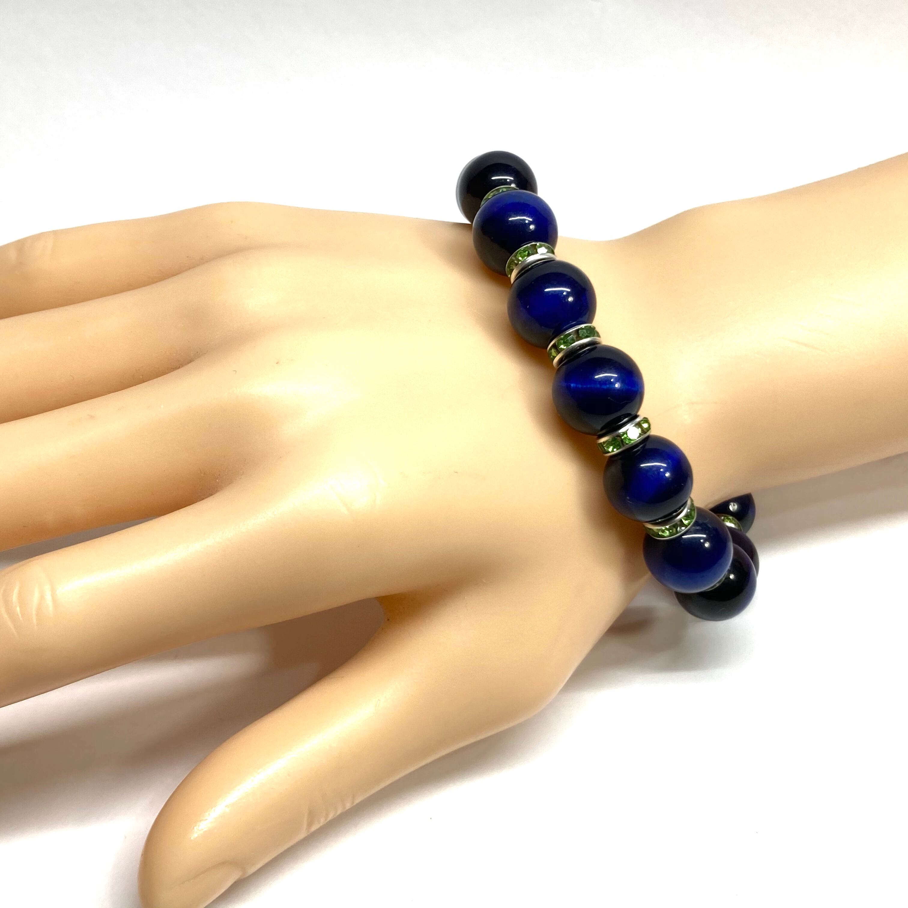 こちらは、12mm玉のブルータイガーアイを使用したブレスレットです。石との間にはロンデルを挟み高級感を演出しています。シンプルなデザインですのでどんなコーディネートとも合わせ易いブレスレットです。石大きさは12mm玉です。内周約18cmです。数に限りがございますので気になる方はお早めにどうぞ。