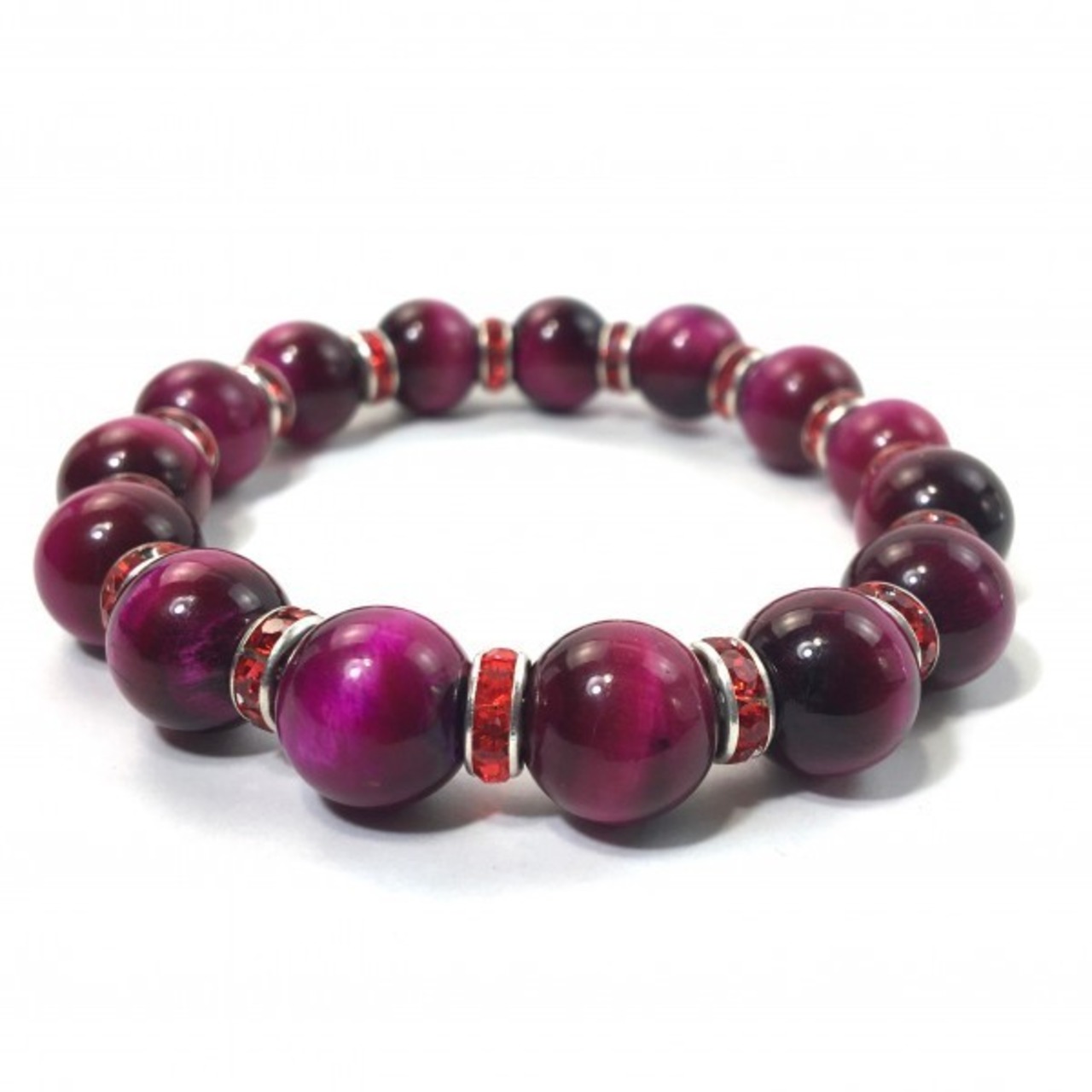 こちらは、12mm玉のピンクタイガーアイを使用したブレスレットです。石との間にはロンデルを挟み高級感を演出しています。シンプルなデザインですのでどんなコーディネートとも合わせ易いブレスレットです。石大きさは12mm玉です。内周約18cmです。気になる方は是非この機会にどうぞ。