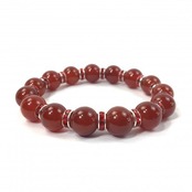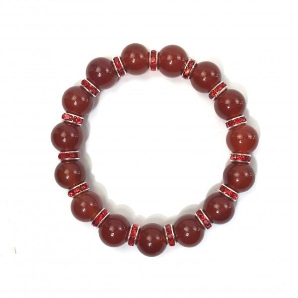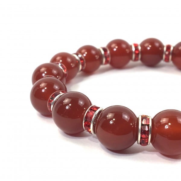 こちらは、12mm玉の赤瑪瑙を使用した天然石ブレスレットです。石との間にはロンデルを挟み高級感を演出しています。シンプルなデザインですのでどんなコーディネートとも合わせ易いブレスレットです。石大きさは12mm玉です。。内周約18cmです。気になる方は是非この機会にどうぞ。