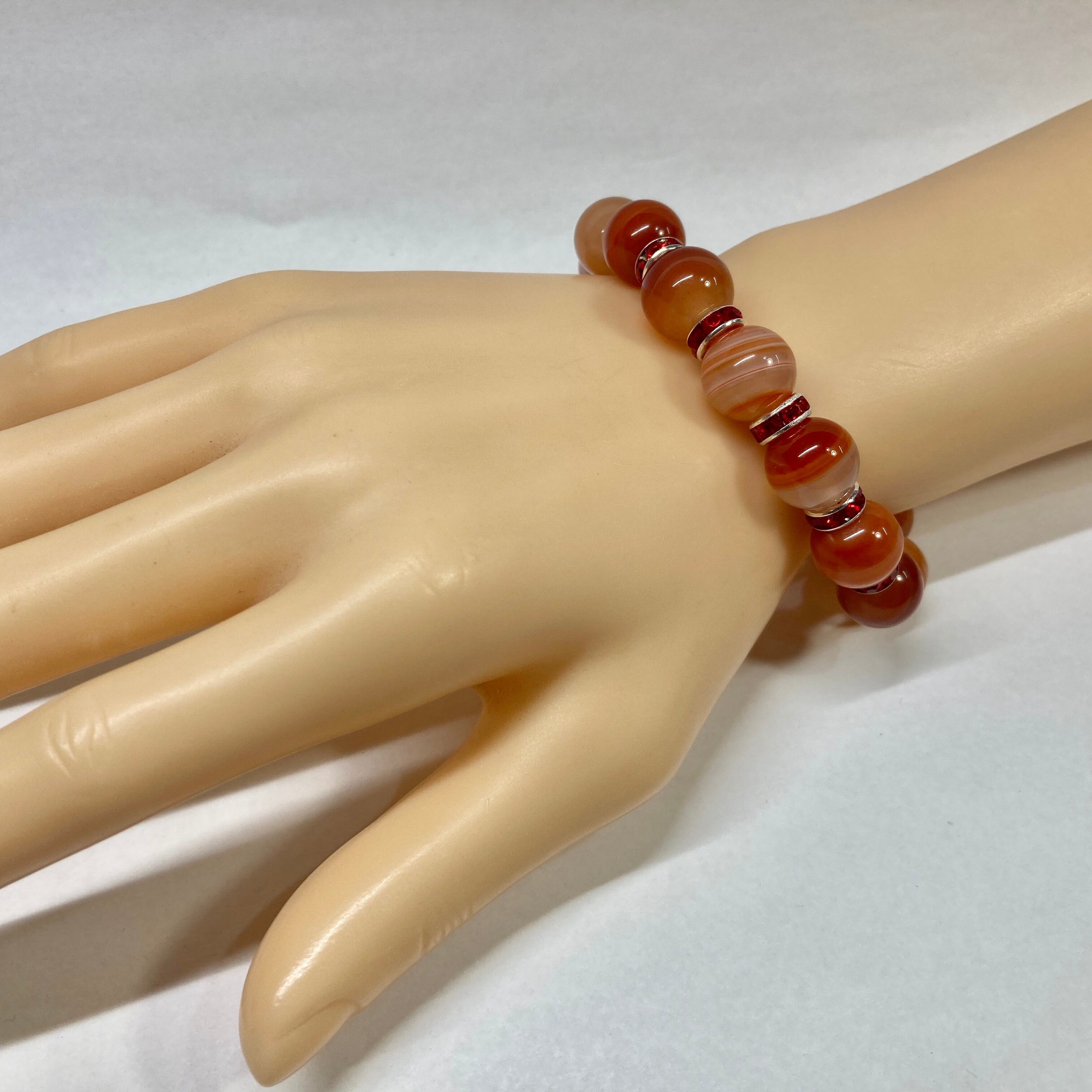 こちらは、12mm玉のカーネリアン・サードニクス(サードオニキス) を使用したパワーストーンブレスレットです。間にはロンデルを挟み高級感を演出しております。男女問わずどんなコーディネートとも合わせ易いブレスレットです。サイズは内周約18cmです。 数に限りがございますので気になる方はお早めにどうぞ。