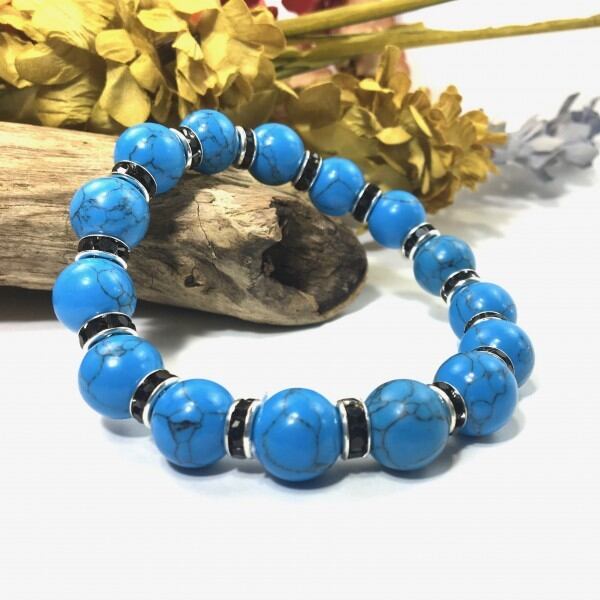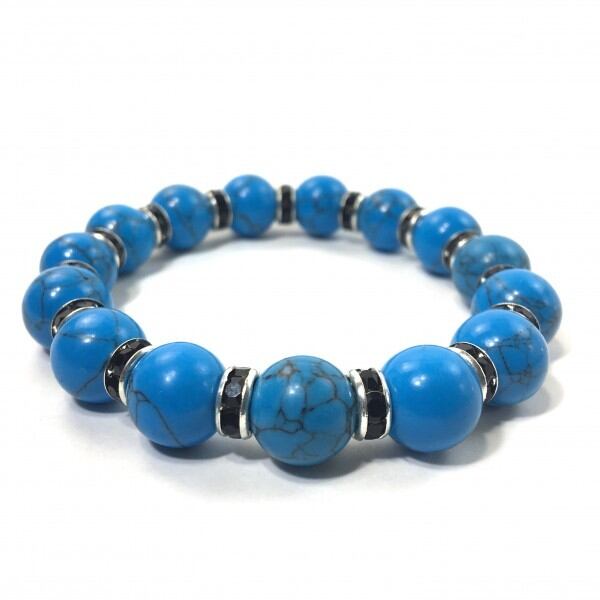 こちらは、12mm玉のターコイズを使用したブレスレットです。石との間にはロンデルを挟み高級感を演出しています。シンプルなデザインですのでどんなコーディネートとも合わせ易いブレスレットです。石大きさは12mm玉です。内周約18cmです。気になる方は是非この機会にどうぞ。