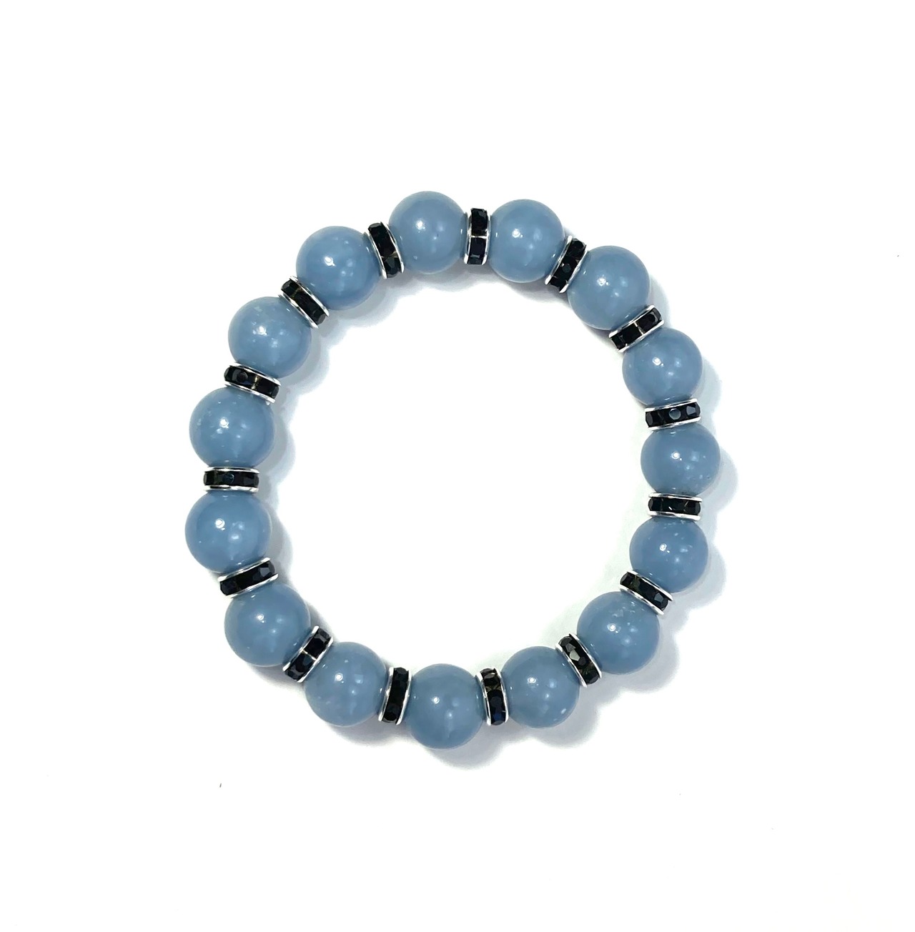 こちらは、12mm玉のエンジェライトを使用した天然石ブレスレットです。石との間にはロンデルを挟み高級感を演出しています。シンプルなデザインですのでどんなコーディネートとも合わせ易いブレスレットです。石大きさは12mm玉です。内周約18cmです。気になる方は是非この機会にどうぞ。