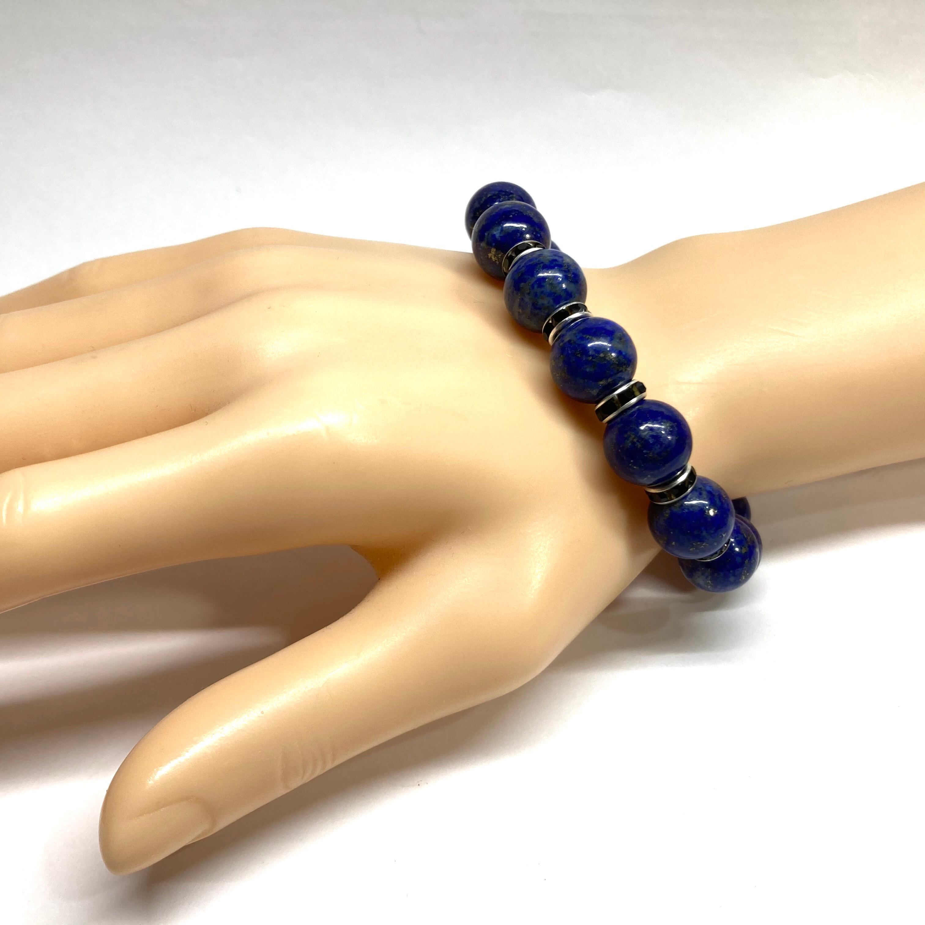 こちらは、12mm玉のラピスラズリを使用した天然石ブレスレットです。石との間にはロンデルを挟み高級感を演出しています。シンプルなデザインですのでどんなコーディネートとも合わせ易いブレスレットです。石大きさは12mm玉です。内周約18cmです。数に限りがございますので気になる方はお早めにどうぞ。