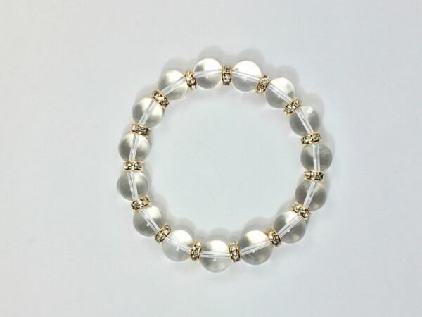 こちらは、12mm玉の水晶を使用した天然石ブレスレットです。石との間にはロンデルを挟み高級感を演出しています。シンプルなデザインですのでどんなコーディネートとも合わせ易いブレスレットです。石大きさは12mm玉です。内周約18cmです。気になる方は是非この機会にどうぞ。