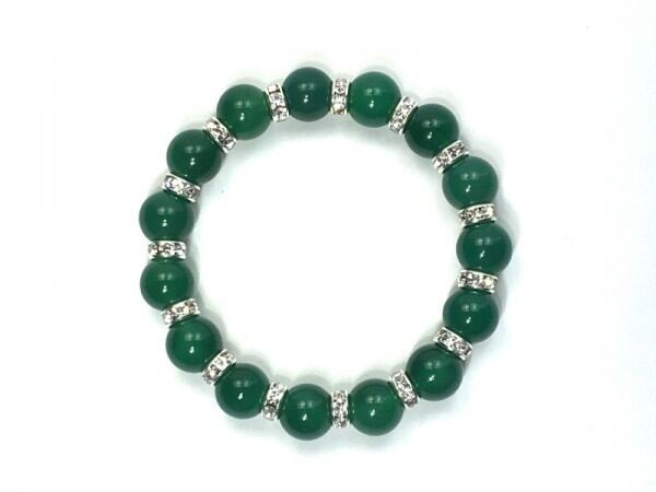 こちらは、12mm玉の緑瑪瑙を使用した天然石ブレスレットです。石との間にはロンデルを挟み高級感を演出しています。シンプルなデザインですのでどんなコーディネートとも合わせ易いブレスレットです。石大きさは12mm玉です。。内周約18cmです。気になる方は是非この機会にどうぞ。
