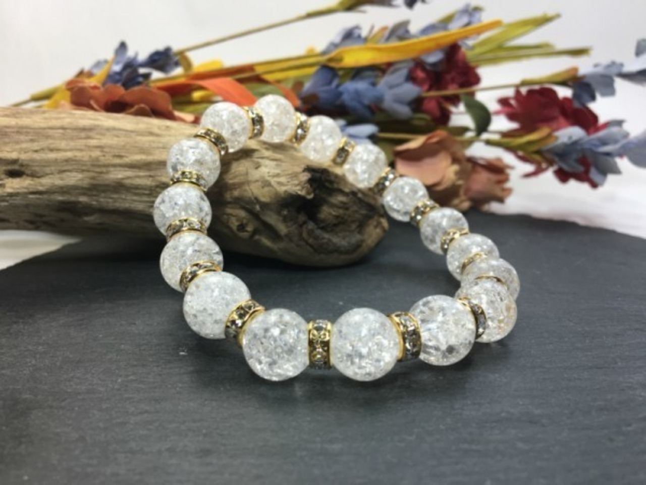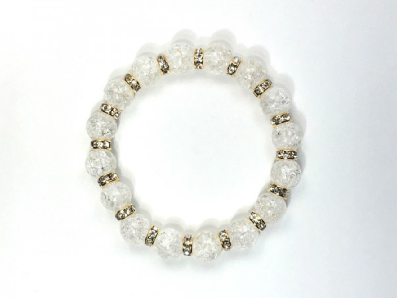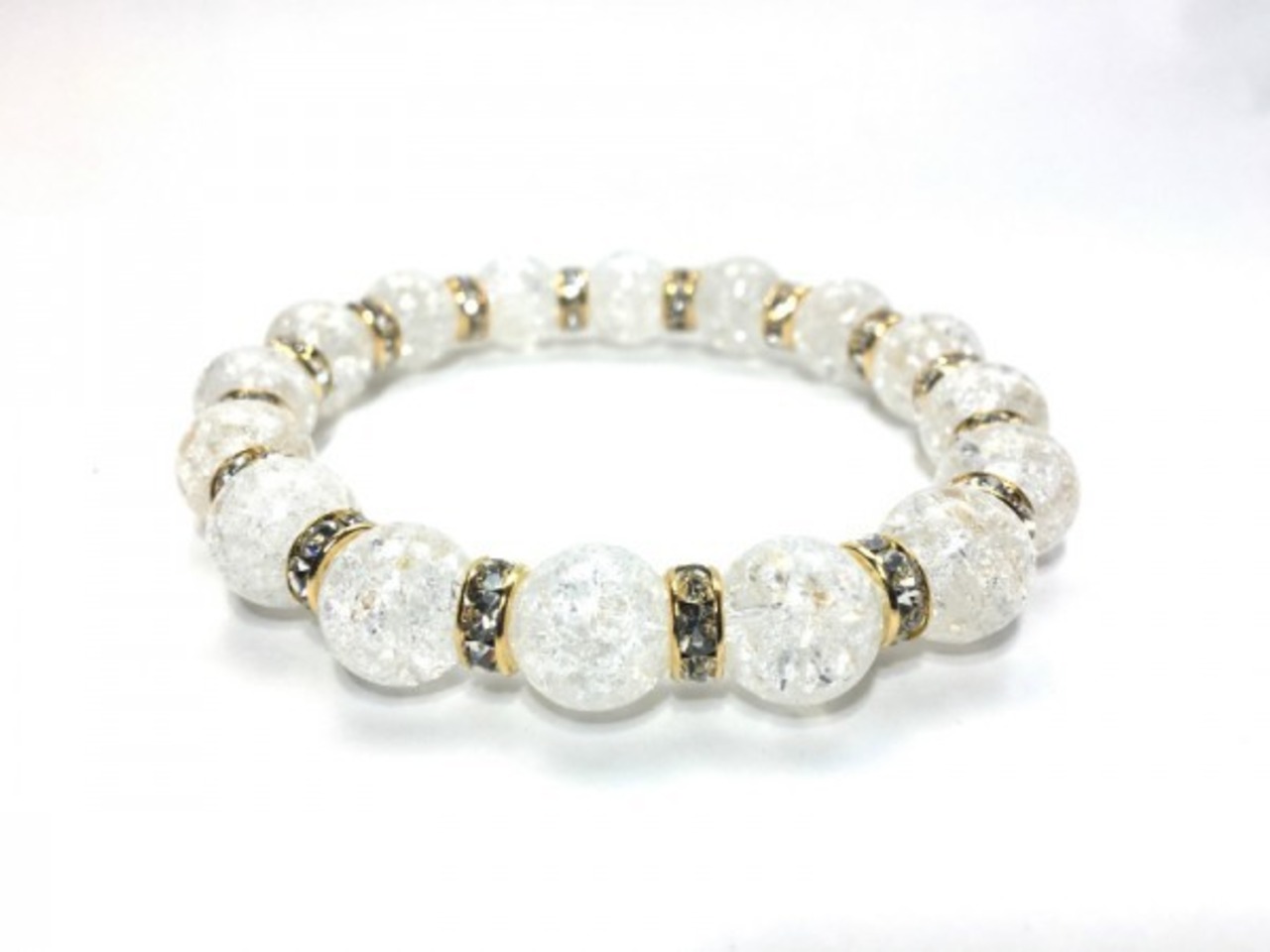 こちらは、12mm玉のクラック水晶を使用した天然石ブレスレットです。石との間にはロンデルを挟み高級感を演出しています。シンプルなデザインですのでどんなコーディネートとも合わせ易いブレスレットです。石大きさは12mm玉です。内周約18cmです。気になる方は是非この機会にどうぞ。