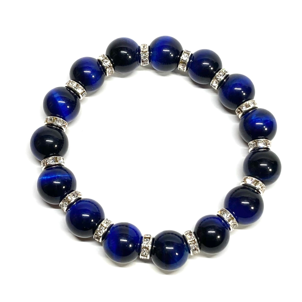 こちらは、12mm玉のブルータイガーアイを使用したブレスレットです。石との間にはロンデルを挟み高級感を演出しています。シンプルなデザインですのでどんなコーディネートとも合わせ易いブレスレットです。石大きさは12mm玉です。内周約18cmです。数に限りがございますので気になる方はお早めにどうぞ。