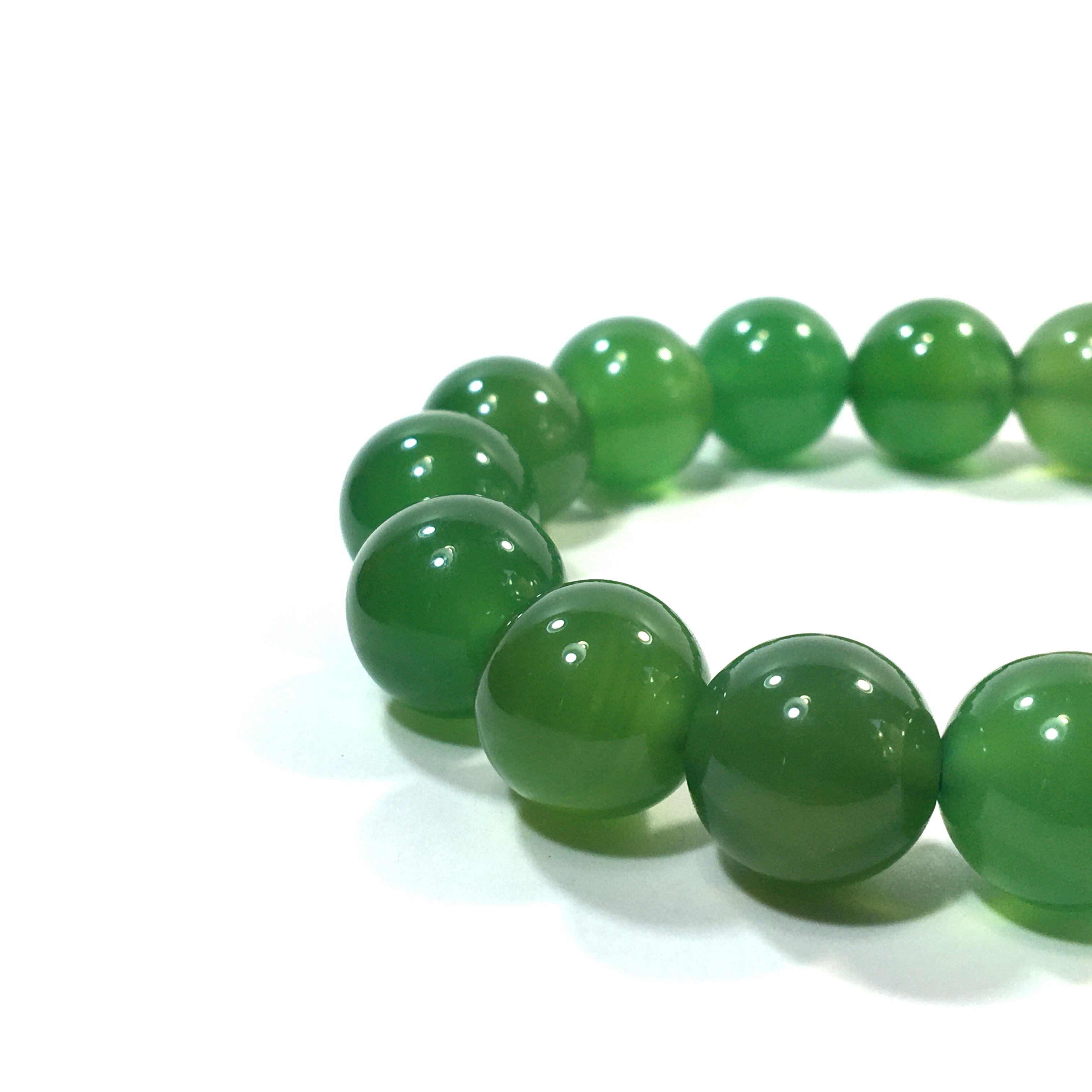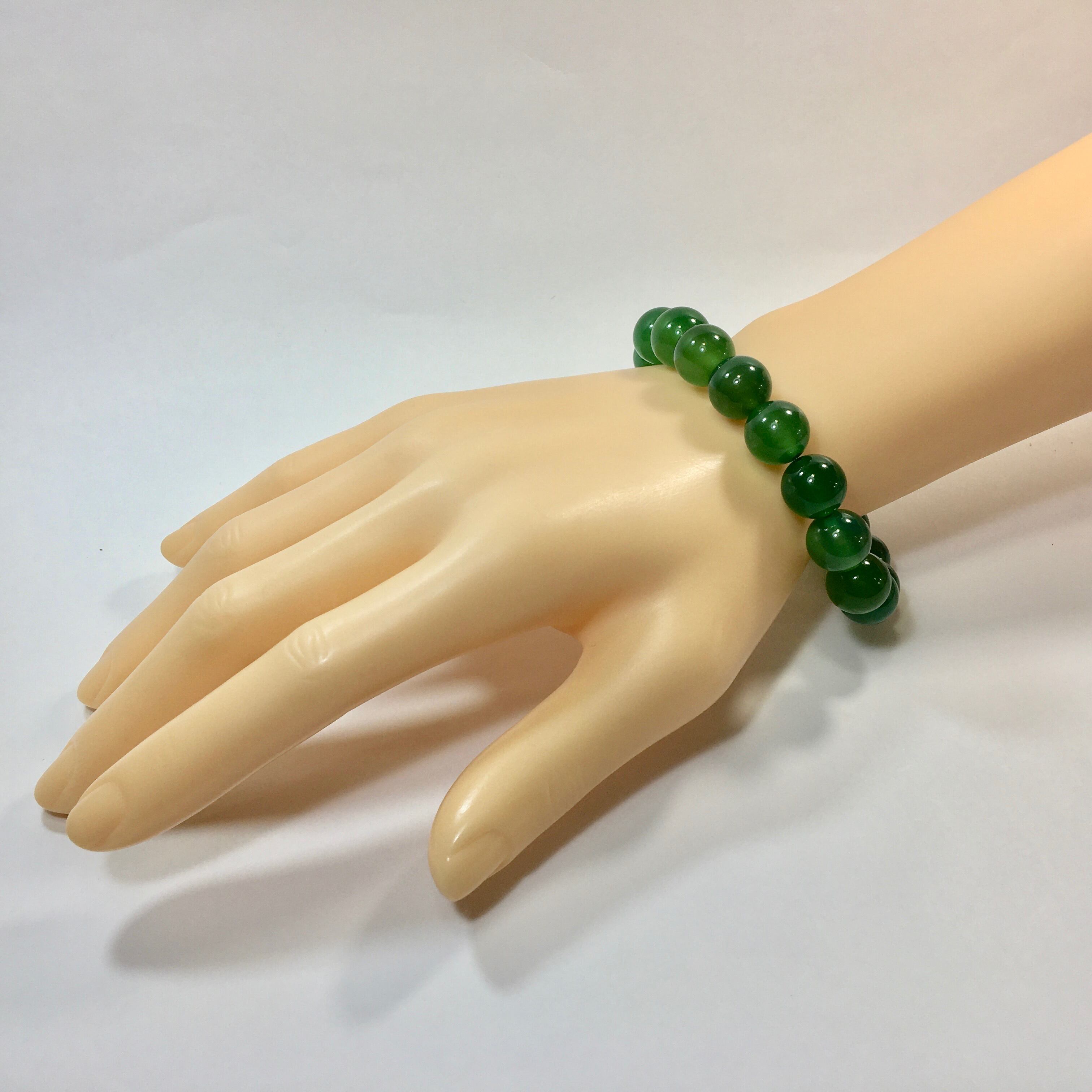 こちらは、12mm玉の緑瑪瑙を使用したブレスレットです。シンプルなデザインですのでどんなコーディネートとも合わせ易いブレスレットです。石大きさは12mm玉です。内周約17cmです。気になる方は是非この機会にどうぞ。