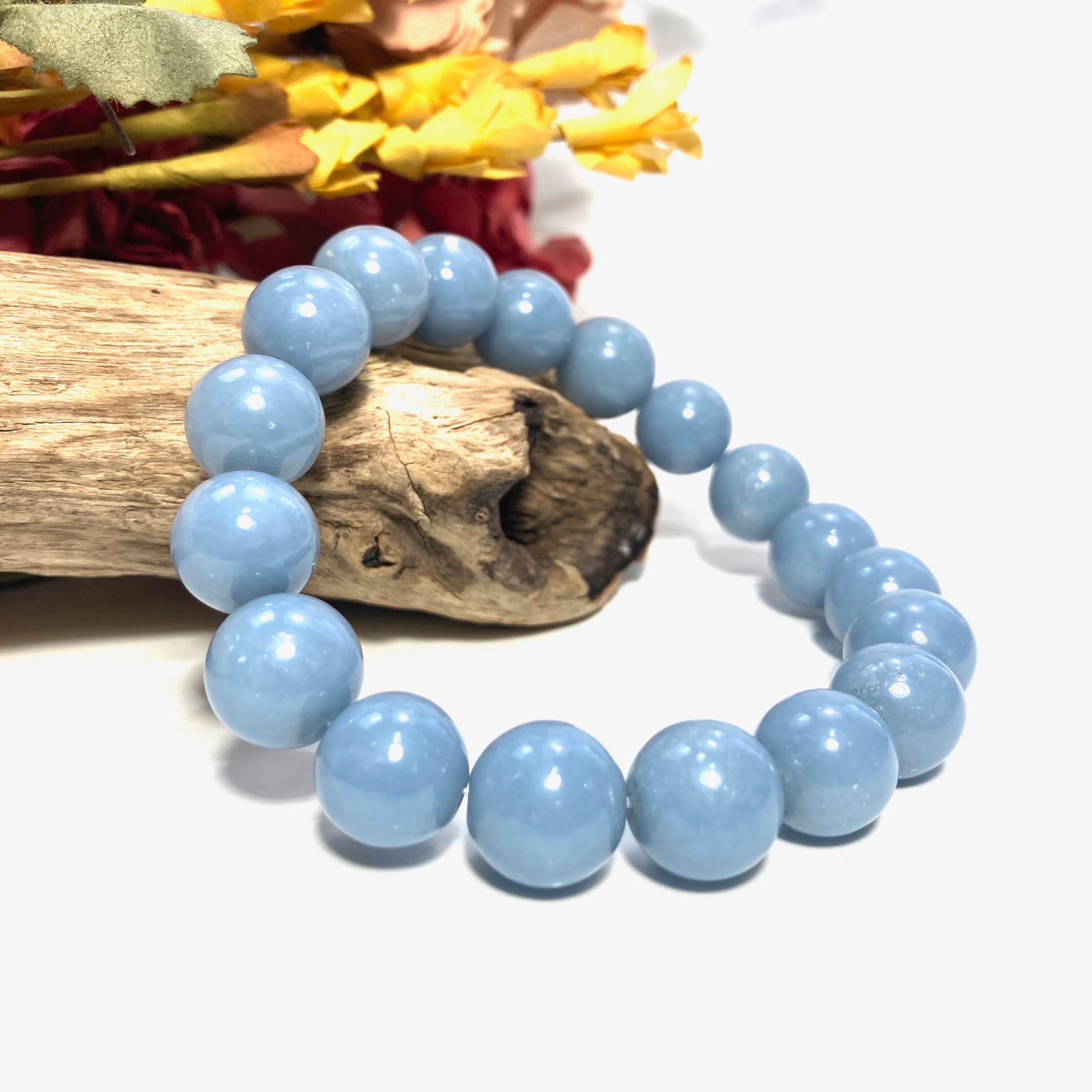 こちらは、12mm玉のエンジェライトを使用した天然石ブレスレットです。シンプルなデザインですのでどんなコーディネートとも合わせ易いブレスレットです。石大きさは12mm玉です。内周約17cmです。気になる方は是非この機会にどうぞ。