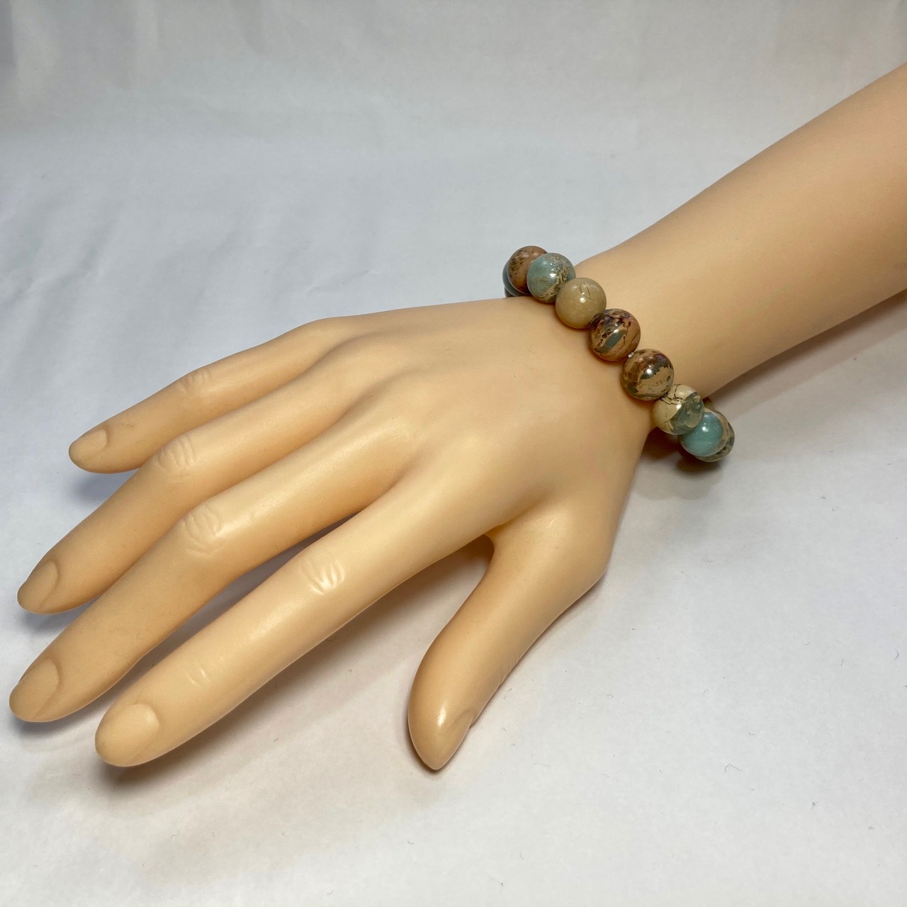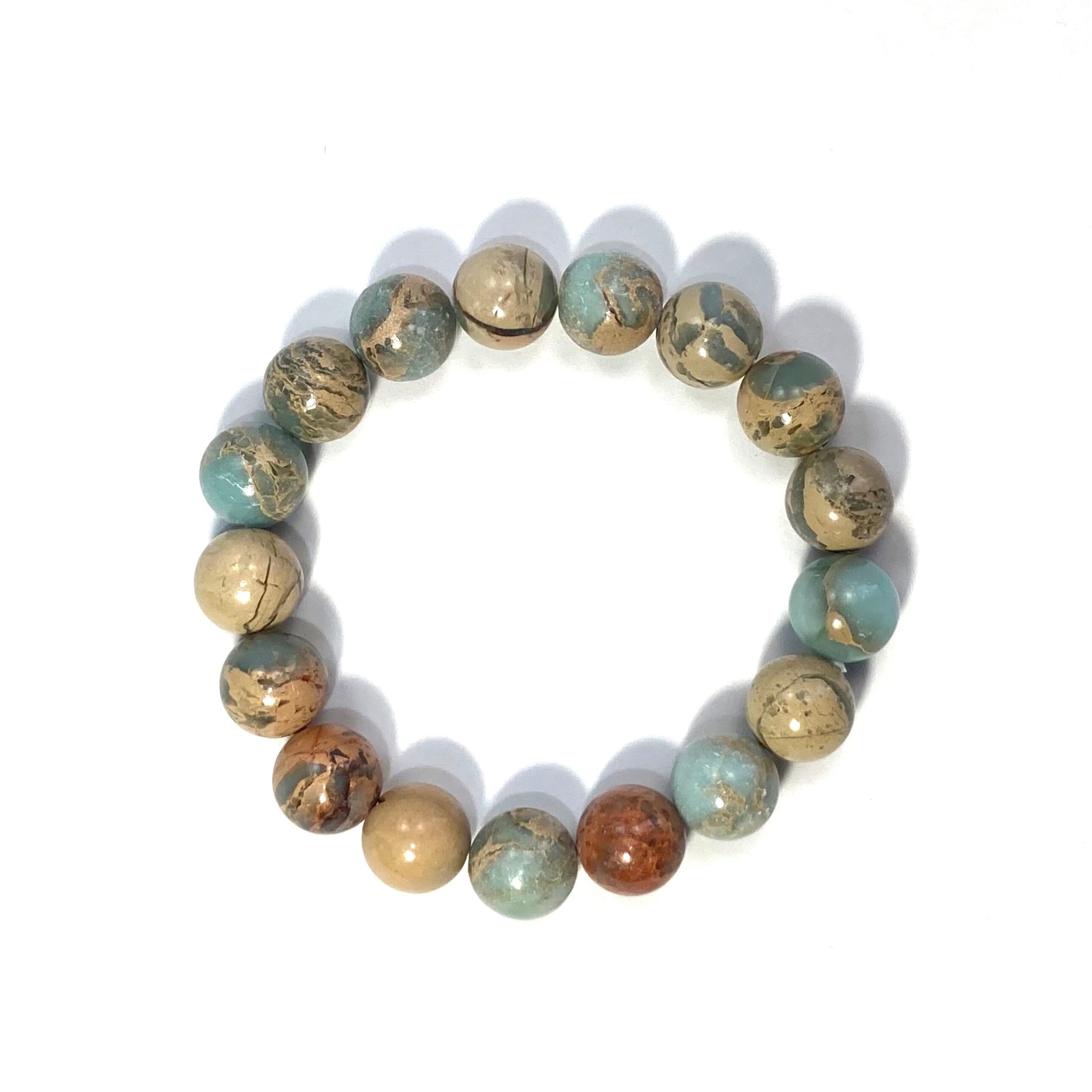 こちらは、12mm玉のインプレッションストーンを使用した天然石ブレスレットです。シンプルなデザインですのでどんなコーディネートとも合わせ易いブレスレットです。石大きさは12mm玉です。内周約17cmです。気になる方は是非この機会にどうぞ。