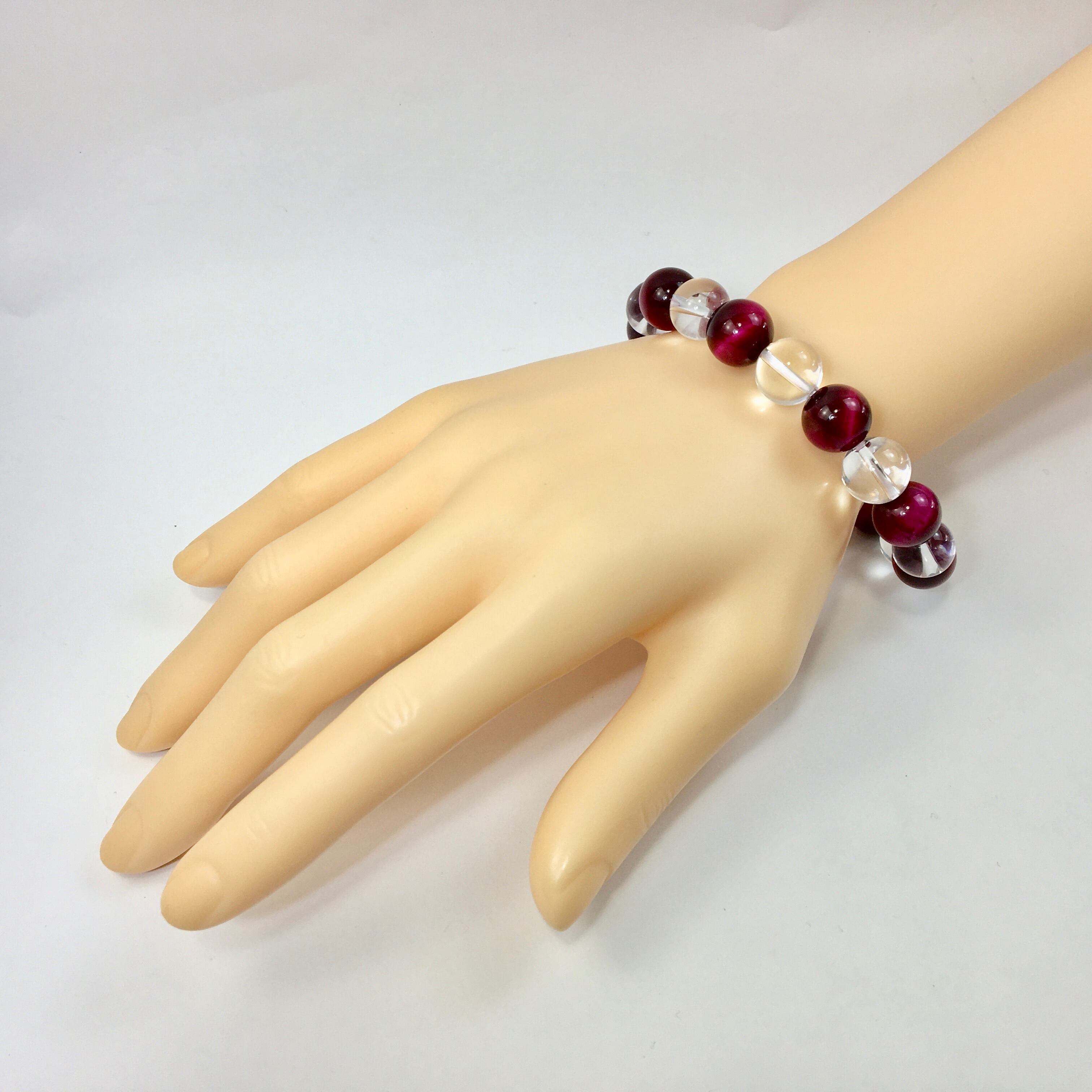こちらは、水晶とピンクタイガーアイを交互に組み合わせたパワーストーンブレスレットです。シンプルなデザインですのでどんなコーディネートとも合わせ易いブレスレットです。程よくインパクトがある12mm玉を使用して内周約18cmです。数に限りがございますので気になる方はお早めにどうぞ。