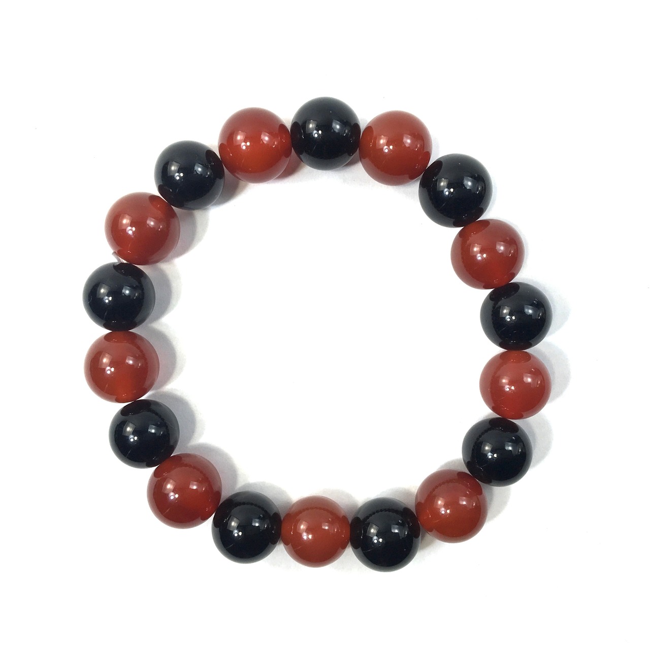 こちらは、オニキスと赤瑪瑙を交互に組み合わせたパワーストーンブレスレットです。シンプルなデザインですのでどんなコーディネートとも合わせ易いブレスレットです。程よくインパクトがある12mm玉を使用して内周約18cmです。数に限りがございますので気になる方はお早めにどうぞ。