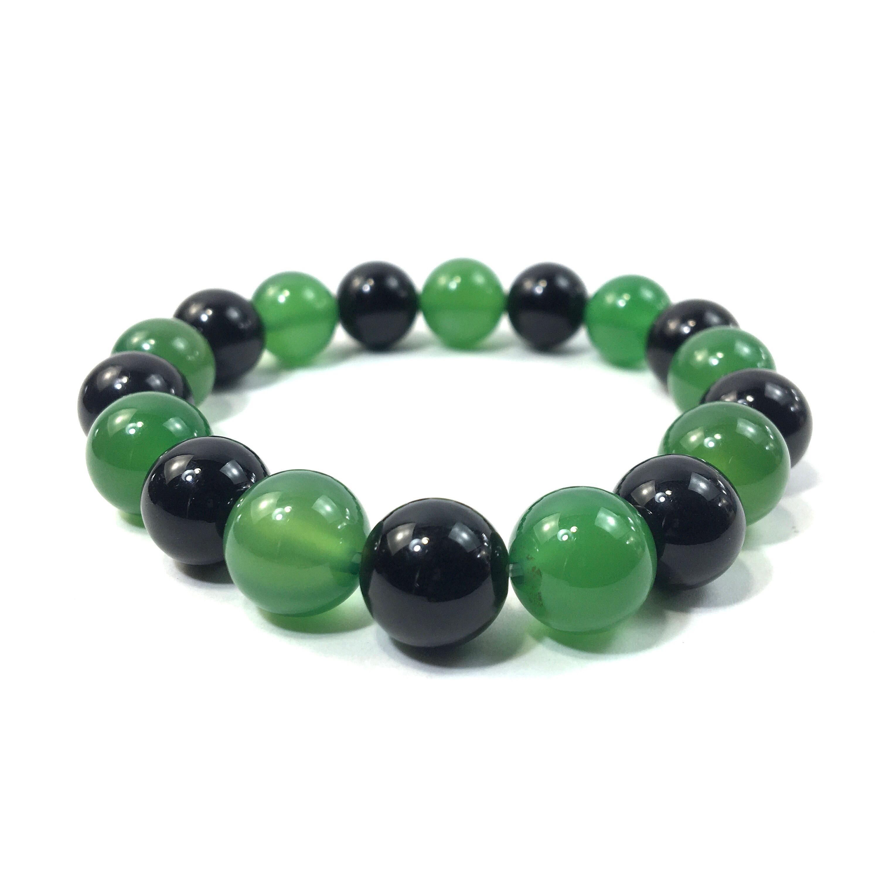 こちらは、オニキスと緑瑪瑙を交互に組み合わせたパワーストーンブレスレットです。シンプルなデザインですのでどんなコーディネートとも合わせ易いブレスレットです。程よくインパクトがある12mm玉を使用して内周約18cmです。数に限りがございますので気になる方はお早めにどうぞ。