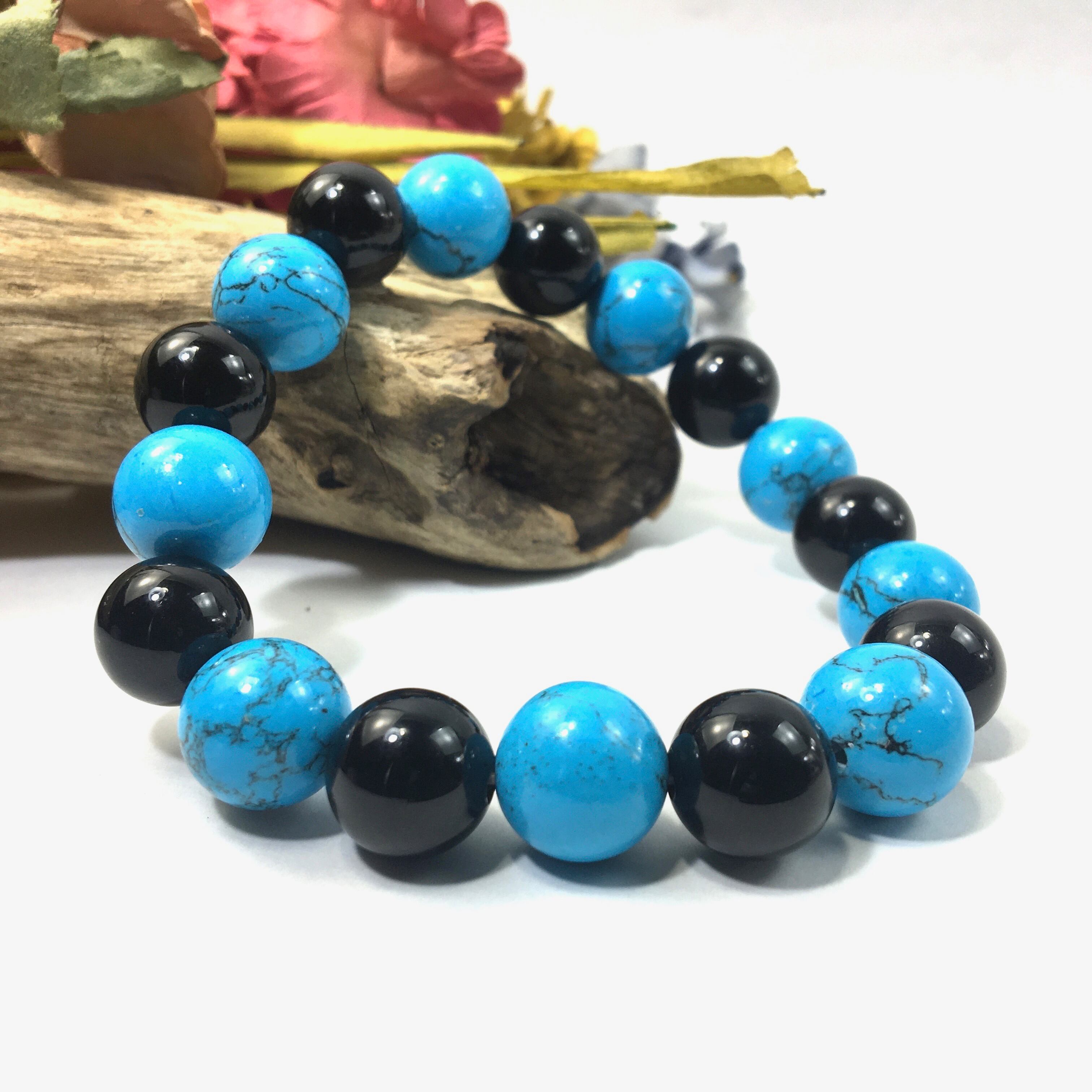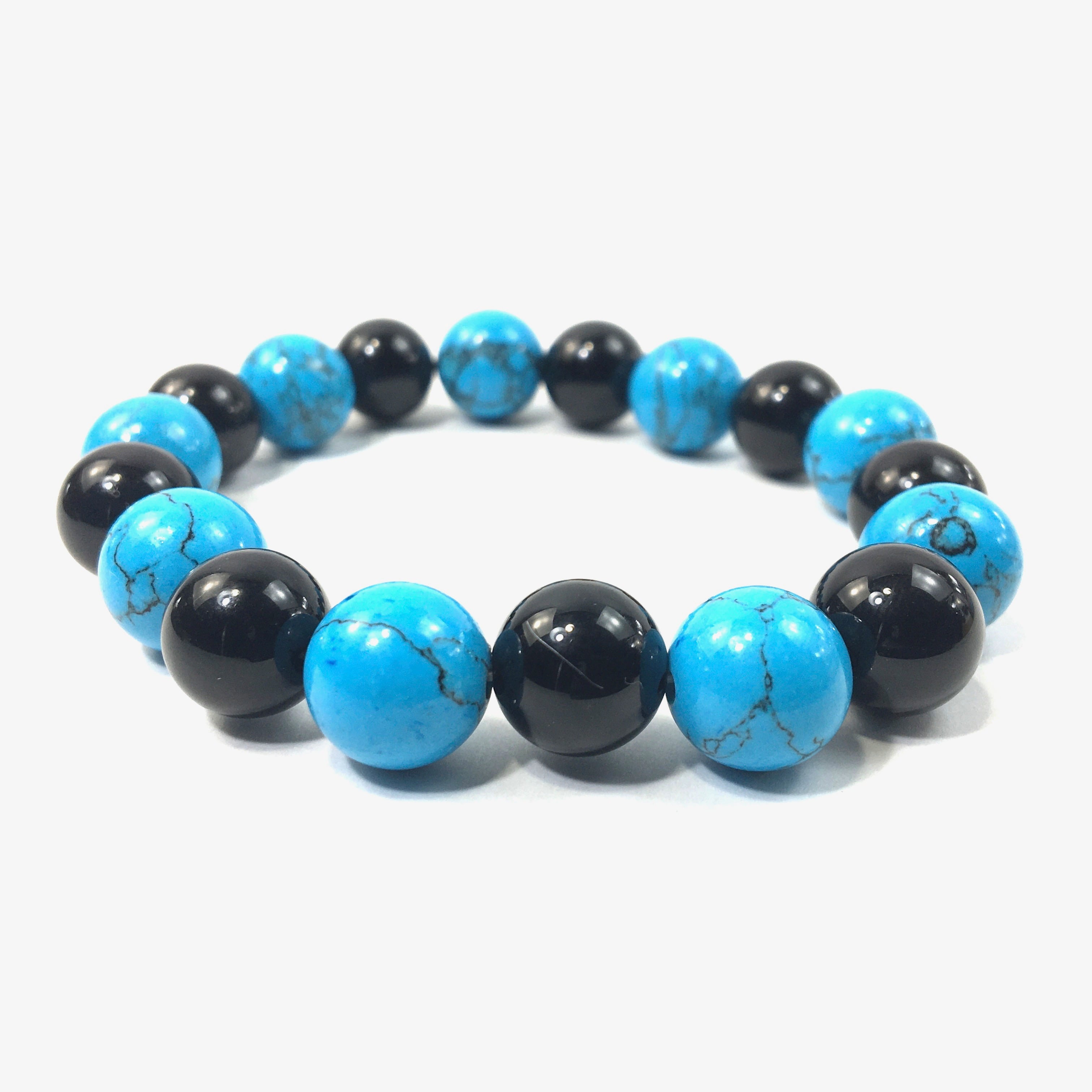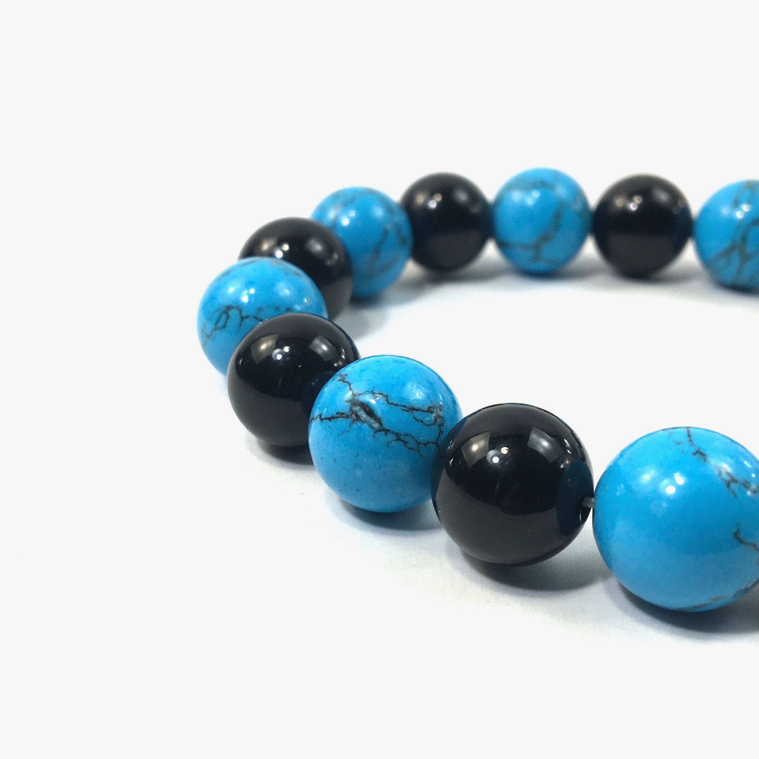 こちらは、オニキスとターコイズを交互に組み合わせたパワーストーンブレスレットです。シンプルなデザインですのでどんなコーディネートとも合わせ易いブレスレットです。程よくインパクトがある12mm玉を使用して内周約18cmです。数に限りがございますので気になる方はお早めにどうぞ。