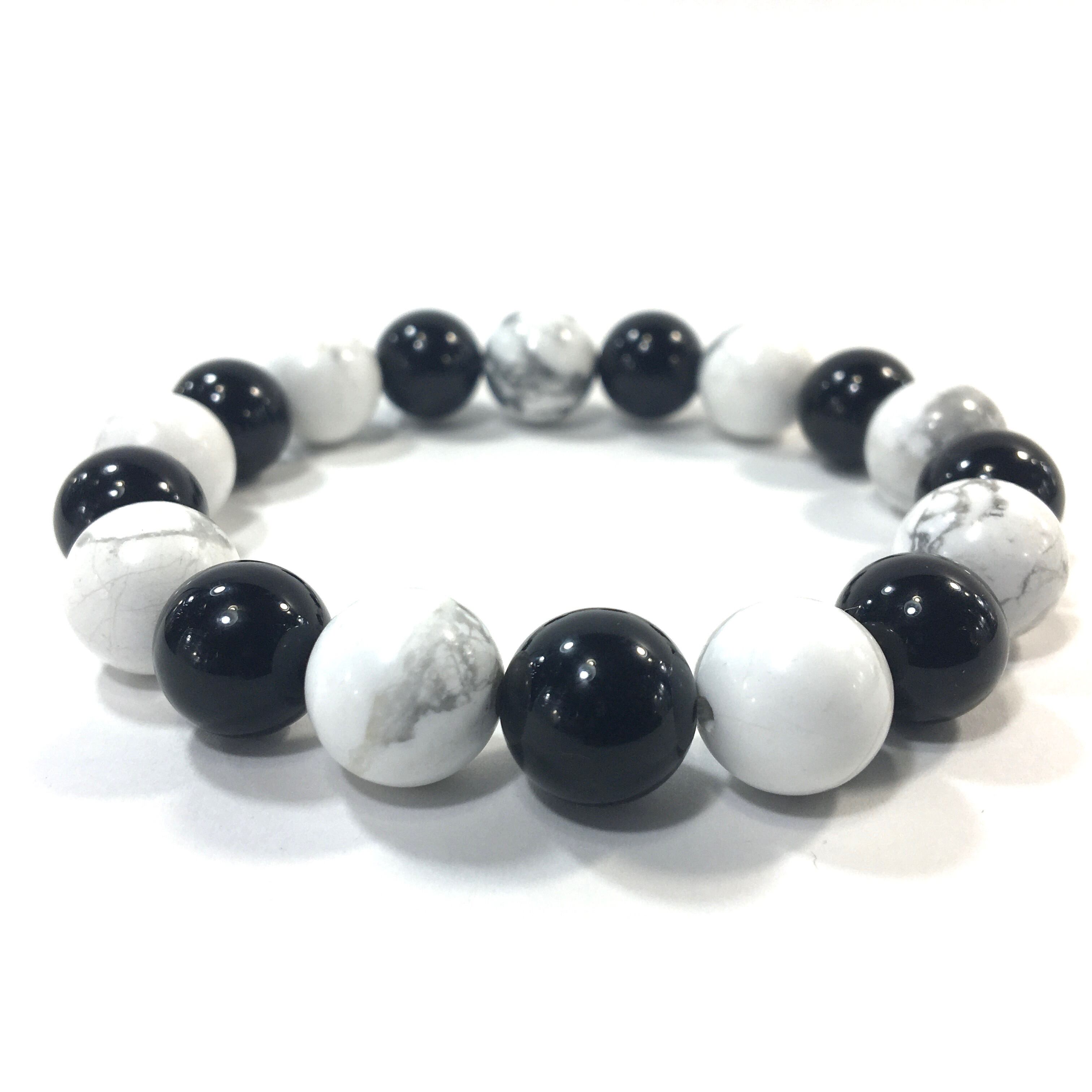 こちらは、オニキスとハウライトを交互に組み合わせたパワーストーンブレスレットです。シンプルなデザインですのでどんなコーディネートとも合わせ易いブレスレットです。程よくインパクトがある12mm玉を使用して内周約18cmです。数に限りがございますので気になる方はお早めにどうぞ。