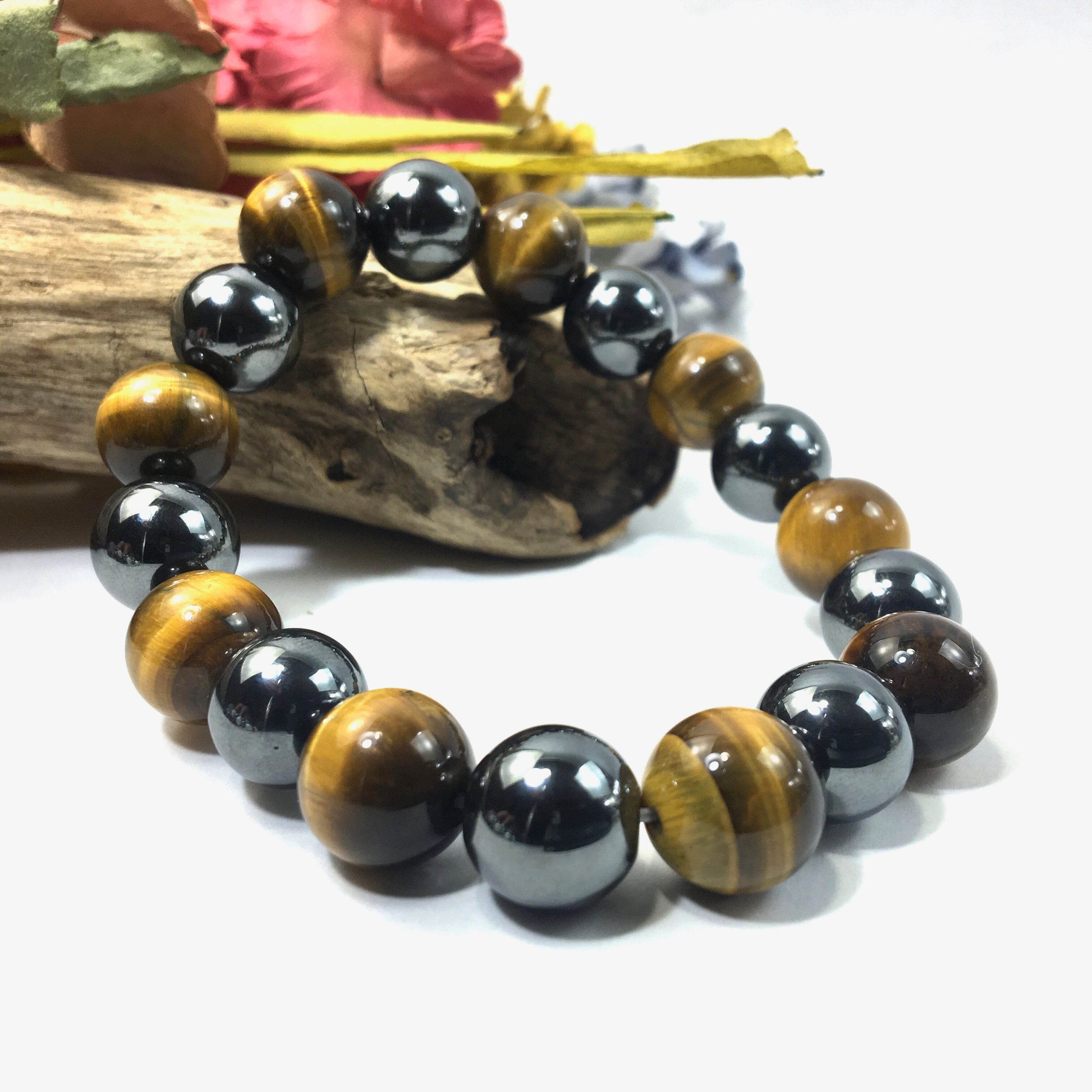 こちらは、ヘマタイトとタイガーアイを交互に組み合わせたパワーストーンブレスレットです。シンプルなデザインですのでどんなコーディネートとも合わせ易いブレスレットです。程よくインパクトがある12mm玉を使用して内周約18cmです。数に限りがございますので気になる方はお早めにどうぞ。