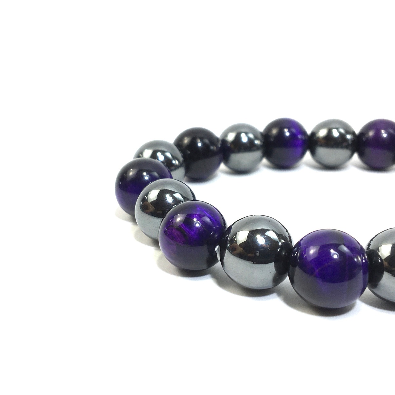 こちらは、ヘマタイトとパープルタイガーアイを交互に組み合わせたパワーストーンブレスレットです。シンプルなデザインですのでどんなコーディネートとも合わせ易いブレスレットです。程よくインパクトがある12mm玉を使用して内周約18cmです。数に限りがございますので気になる方はお早めにどうぞ。