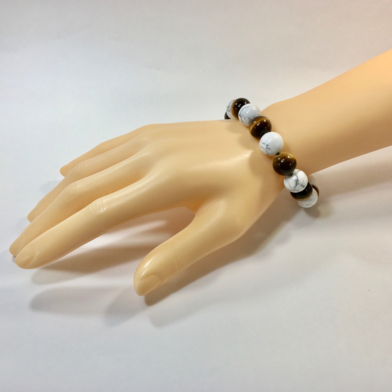 こちらは、ハウライトとタイガーアイを交互に組み合わせたパワーストーンブレスレットです。シンプルなデザインですのでどんなコーディネートとも合わせ易いブレスレットです。程よくインパクトがある12mm玉を使用して内周約18cmです。数に限りがございますので気になる方はお早めにどうぞ。
