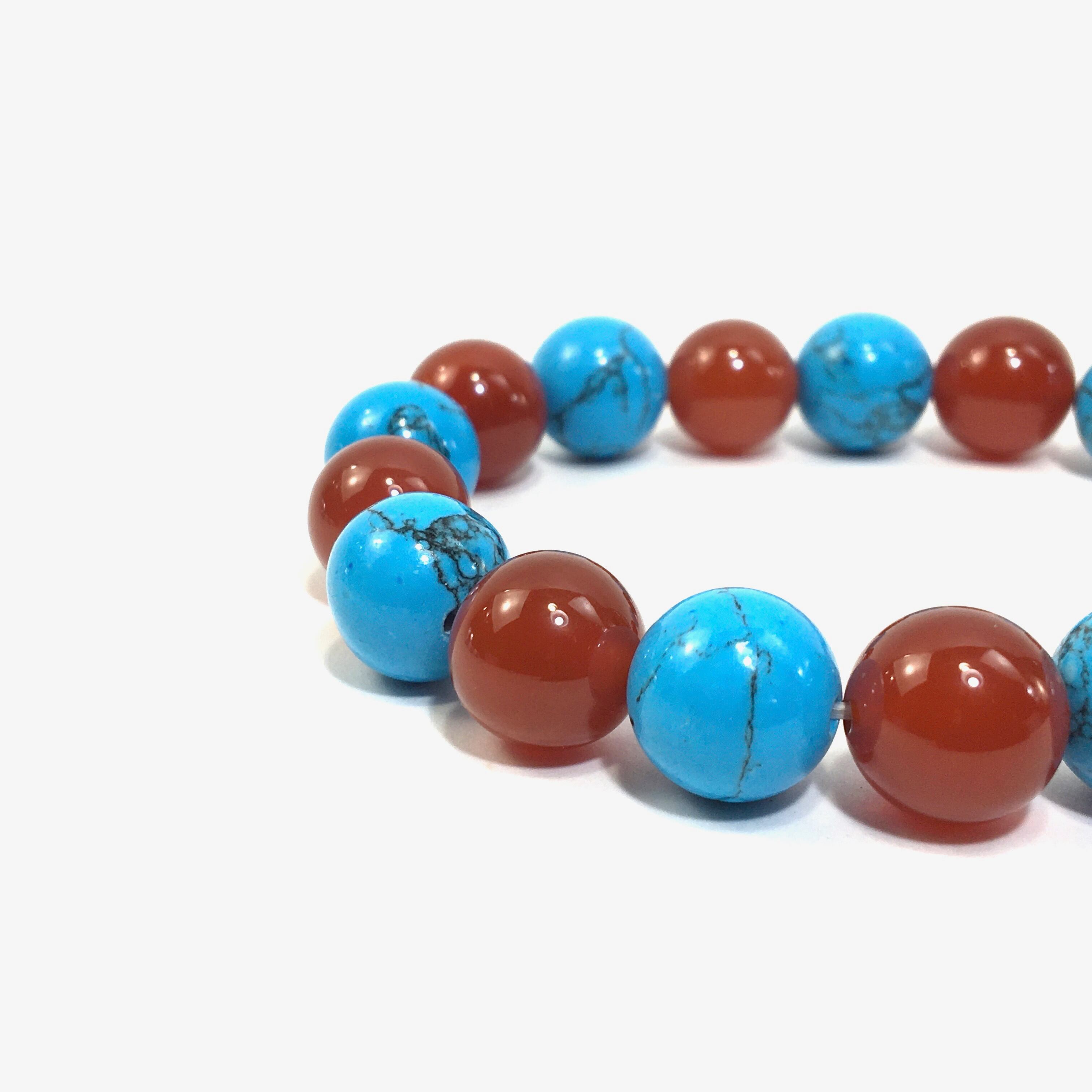 こちらは、ターコイズと赤瑪瑙を交互に組み合わせたパワーストーンブレスレットです。シンプルなデザインですのでどんなコーディネートとも合わせ易いブレスレットです。程よくインパクトがある12mm玉を使用して内周約18cmです。数に限りがございますので気になる方はお早めにどうぞ。