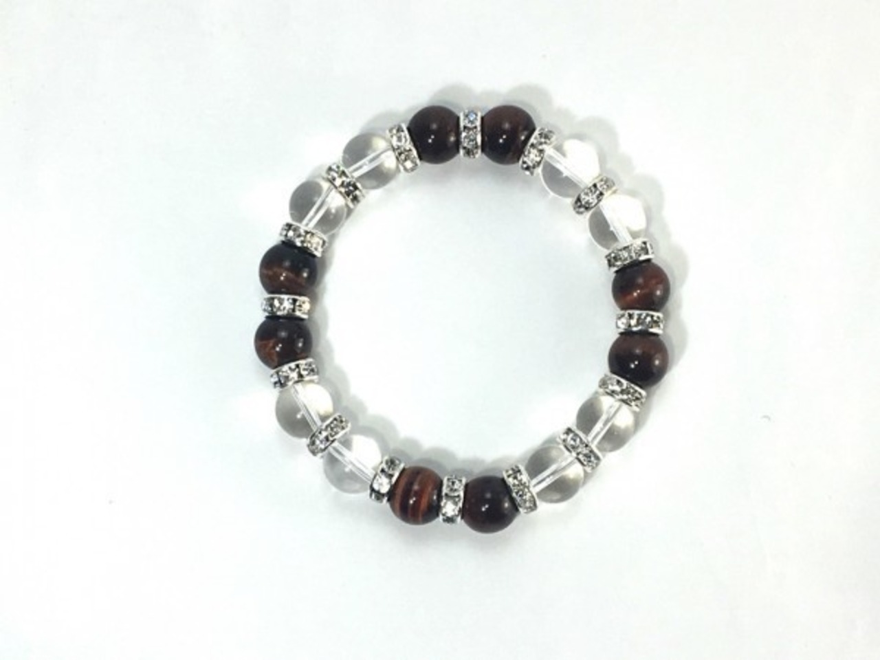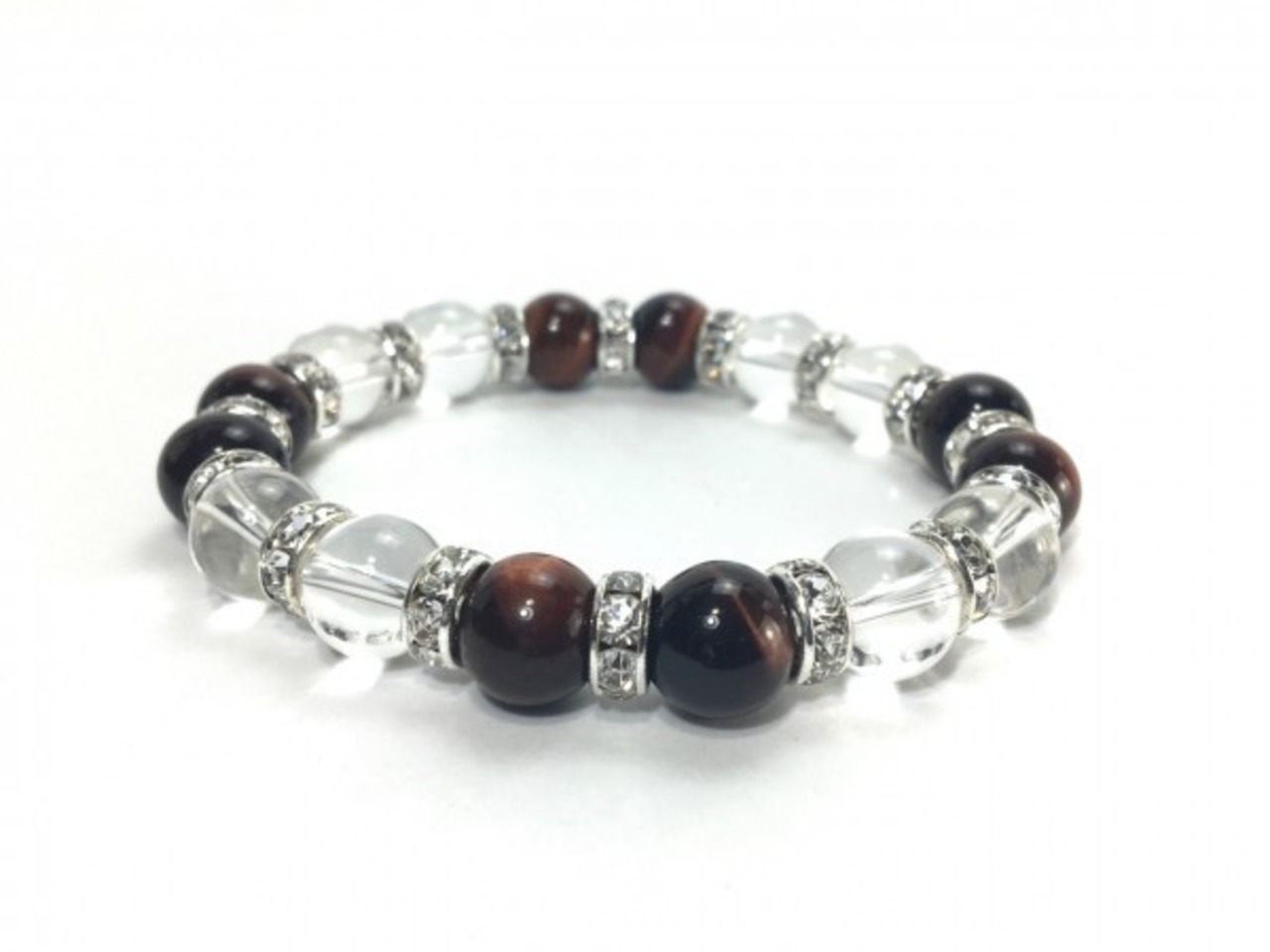 こちらは、レッドタイガーアイと水晶を組み合わせたブレスレットです。間にはロンデルを挟み高級感あるデザインに仕上がっています。石大きさは腕にも馴染みやすいように10mm玉で内周約16cm(伸可能)です。数に限りがございますので気になる方はお早めにどうぞ。