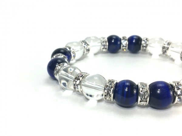 こちらは、ブルータイガーアイと水晶を組み合わせたブレスレットです。間にはロンデルを挟み高級感あるデザインに仕上がっています。石大きさは腕にも馴染みやすいように10mm玉で内周約16cm(伸可能)です。数に限りがございますので気になる方はお早めにどうぞ。