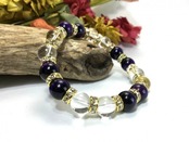 こちらは、パープルタイガーアイと水晶を組み合わせたブレスレットです。間にはロンデルを挟み高級感あるデザインに仕上がっています。石大きさは腕にも馴染みやすいように10mm玉で内周約16cm(伸可能)です。数に限りがございますので気になる方はお早めにどうぞ。