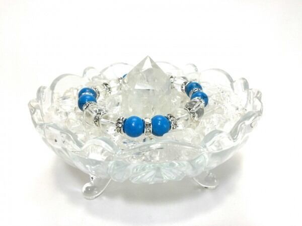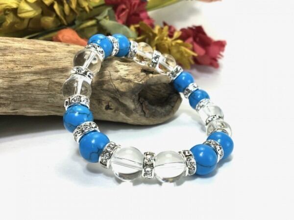 こちらは、ターコイズと水晶を組み合わせたブレスレットです。間にはロンデルを挟み高級感あるデザインに仕上がっています。石大きさは腕にも馴染みやすいように10mm玉で内周約16cm(伸可能)です。数に限りがございますので気になる方はお早めにどうぞ。
