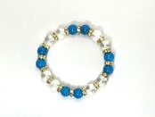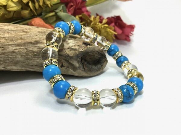 こちらは、ターコイズと水晶を組み合わせたブレスレットです。間にはロンデルを挟み高級感あるデザインに仕上がっています。石大きさは腕にも馴染みやすいように10mm玉で内周約16cm(伸可能)です。数に限りがございますので気になる方はお早めにどうぞ。