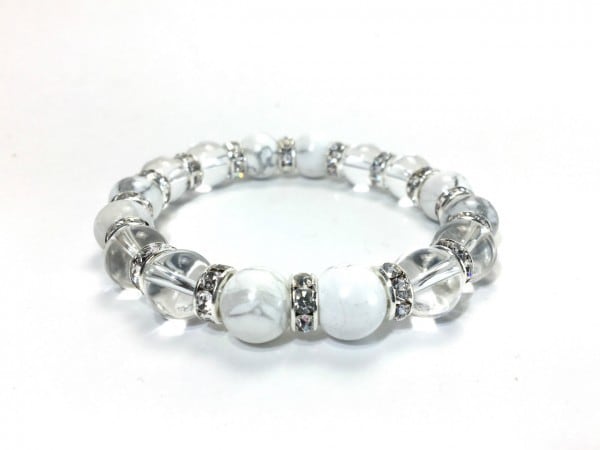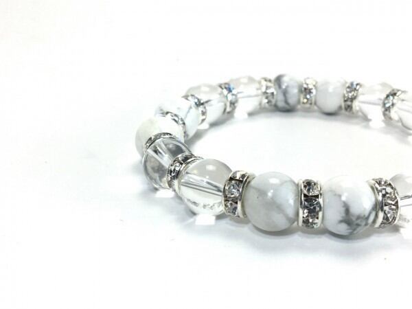 こちらは、ハウライトと水晶を組み合わせたブレスレットです。間にはロンデルを挟み高級感あるデザインに仕上がっています。石大きさは腕にも馴染みやすいように10mm玉で内周約16cm(伸可能)です。数に限りがございますので気になる方はお早めにどうぞ。