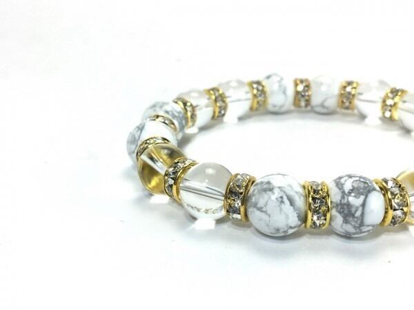 こちらは、ハウライトと水晶を組み合わせたブレスレットです。間にはロンデルを挟み高級感あるデザインに仕上がっています。石大きさは腕にも馴染みやすいように10mm玉で内周約16cm(伸可能)です。数に限りがございますので気になる方はお早めにどうぞ。