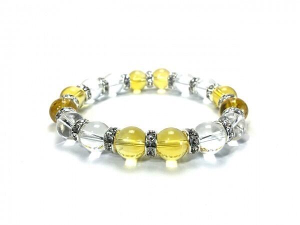 こちらは、シトリンと水晶を組み合わせたブレスレットです。間にはロンデルを挟み高級感あるデザインに仕上がっています。石大きさは腕にも馴染みやすいように10mm玉で内周約16cm(伸可能)です。数に限りがございますので気になる方はお早めにどうぞ。