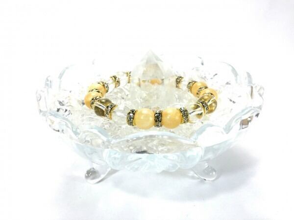 こちらは、アラゴナイトと水晶を組み合わせたブレスレットです。間にはロンデルを挟み高級感あるデザインに仕上がっています。石大きさは腕にも馴染みやすいように10mm玉で内周約16cm(伸可能)です。数に限りがございますので気になる方はお早めにどうぞ。