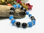 こちらは、ターコイズとオニキスを組み合わせたブレスレットです。間にはロンデルを挟み高級感あるデザインに仕上がっています。石大きさは腕にも馴染みやすいように10mm玉で内周約16cm(伸可能)です。数に限りがございますので気になる方はお早めにどうぞ。