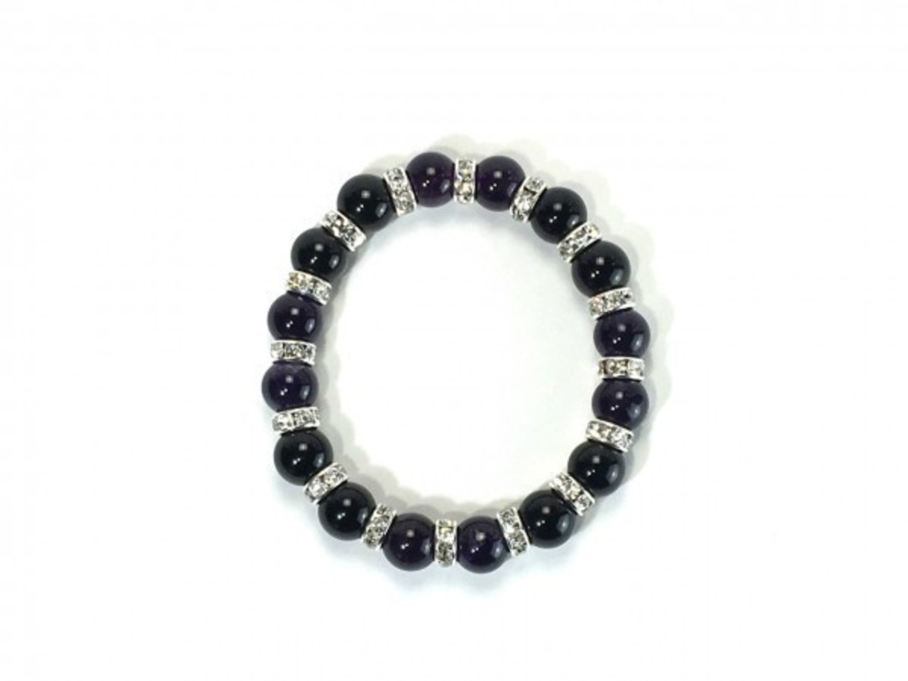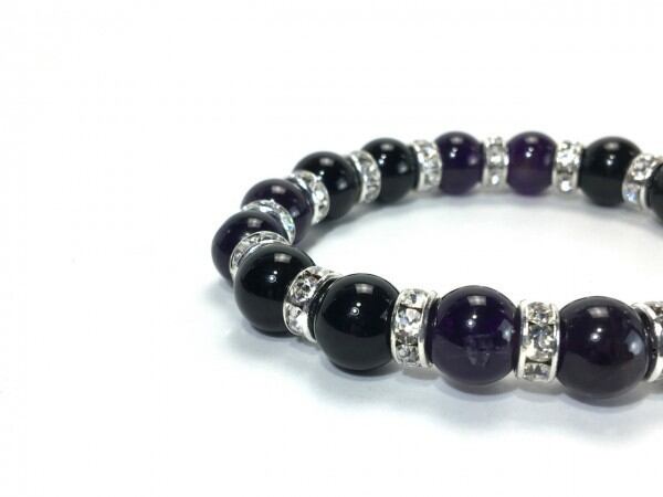 こちらは、アメジストとオニキスを組み合わせたブレスレットです。間にはロンデルを挟み高級感あるデザインに仕上がっています。石大きさは腕にも馴染みやすいように10mm玉で内周約16cm(伸可能)です。数に限りがございますので気になる方はお早めにどうぞ。
