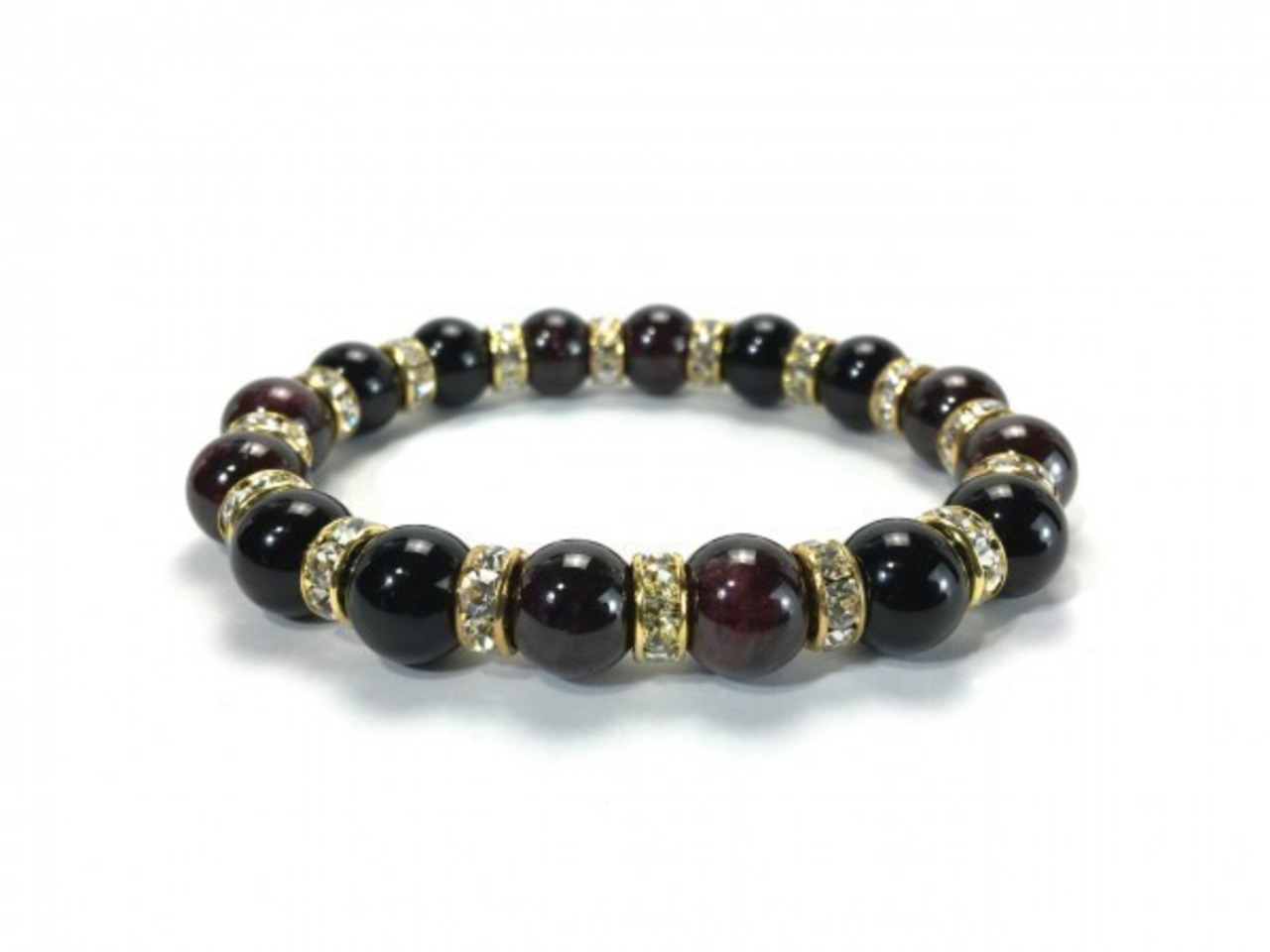 こちらは、ガーネットとオニキスを組み合わせたブレスレットです。間にはロンデルを挟み高級感あるデザインに仕上がっています。石大きさは腕にも馴染みやすいように10mm玉で内周約16cm(伸可能)です。数に限りがございますので気になる方はお早めにどうぞ。