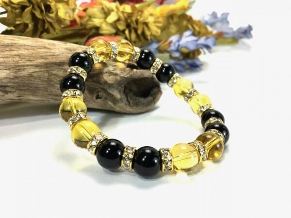 こちらは、シトリンとオニキスを組み合わせたブレスレットです。間にはロンデルを挟み高級感あるデザインに仕上がっています。石大きさは腕にも馴染みやすいように10mm玉で内周約16cm(伸可能)です。数に限りがございますので気になる方はお早めにどうぞ。