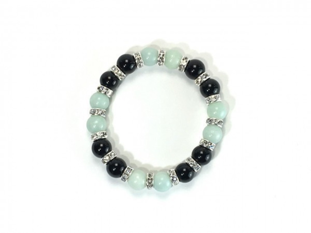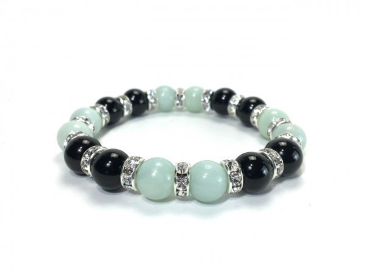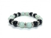 こちらは、アマゾナイトとオニキスを組み合わせたブレスレットです。間にはロンデルを挟み高級感あるデザインに仕上がっています。石大きさは腕にも馴染みやすいように10mm玉で内周約16cm(伸可能)です。数に限りがございますので気になる方はお早めにどうぞ。