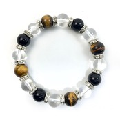 こちらは、タイガーアイと水晶とオニキスを組み合わせたブレスレットです。間にはロンデルを挟み高級感あるデザインに仕上がっています。石大きさは腕にも馴染みやすいように10mm玉で内周約16cmです。数に限りがございますので気になる方はお早めにどうぞ。