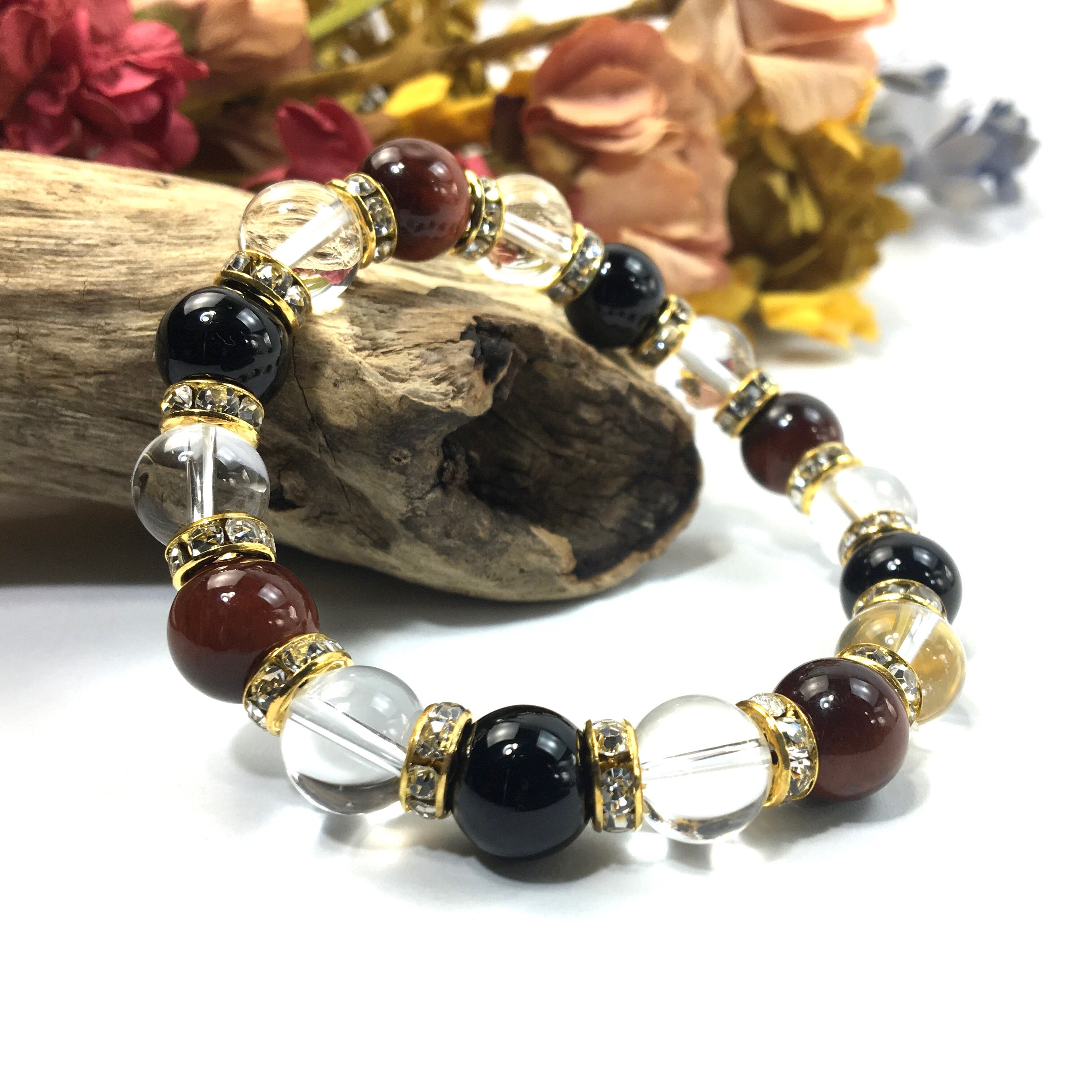 レッドタイガーアイ×水晶×オニキス パワーストーン ブレスレット 10mm(ゴールド)メンズ・レディース 男性・女性 数珠ブレス 開運 ☆